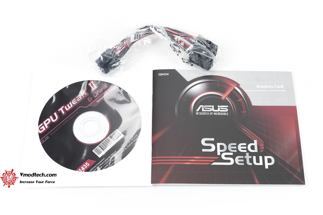 ภายในกล่องจะมีของแถมเป็นเอกสารแนะนำ รวมถึงแผ่นยูทิลิตี๊และ Driver มาให้ด้วยพร้อมกับหัวแปลงไฟจาก PCIe หกพินสองหัวเป็น PCIe แปดพินหนึ่งหัว
