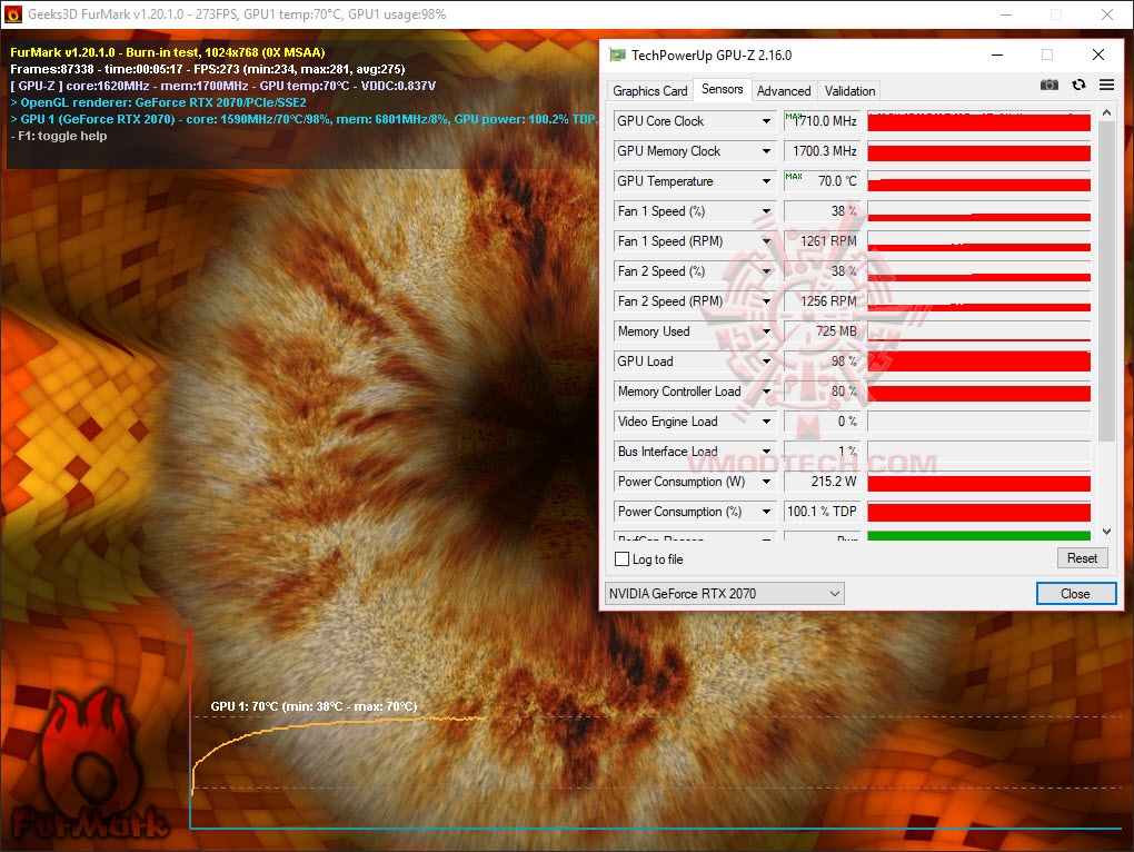 ความร้อนนั้นสูงสุดอยู่ที่ไม่เกิน 70 องศาเซลเซียสนอกเคสโดยที่รอบพัดลมทำงานตามโพรไฟล์ของการ์ด เสียงรบกวนนั้นเบามากเรียกว่าแทบไม่ได้ยินเลย