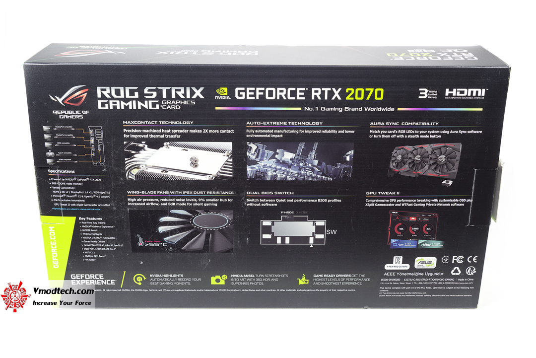 สวัสดีครับสมาชิกเว็บไซด์ Vmodtech.com วันนี้เรายังคงมีกราฟฟิกการ์ดจากแบรนด์ ASUS มาทำการทดสอบให้ได้ชมกันครับโดยวันนี้เราจะพูดถึง ASUS GeForce RTX 2070 ROG STRIX Gaming กราฟฟิกการ์ดที่ใช้ GPU ขนาดกลางที่สามารถจะเล่นเกมส์โหดๆได้แทบทุกเกมส์บนการปรับแต่งค่าระดับสูง ความโดดเด่นของตัวการ์ด ASUS GeForce RTX 2070 ROG STRIX Gaming นั้นจะอยู่ที่ชุดระบายความร้อนที่ออกแบบมาให้มีเอกลักษณ์เฉพาะตัวด้วยรูปลักษณ์และเทกเจอร์ที่แปลกตาของซีรีย์ ROG ครับ โดยที่ตัวการ์ดนั้นสามารถปรับแต่งแสงสีได้ครอบคลุม RGB และสามารถปรับแต่ง effect ได้อีกหกรูปแบบด้วย น่าสนใจมากนะครับ เรามาติดตามกันเลย