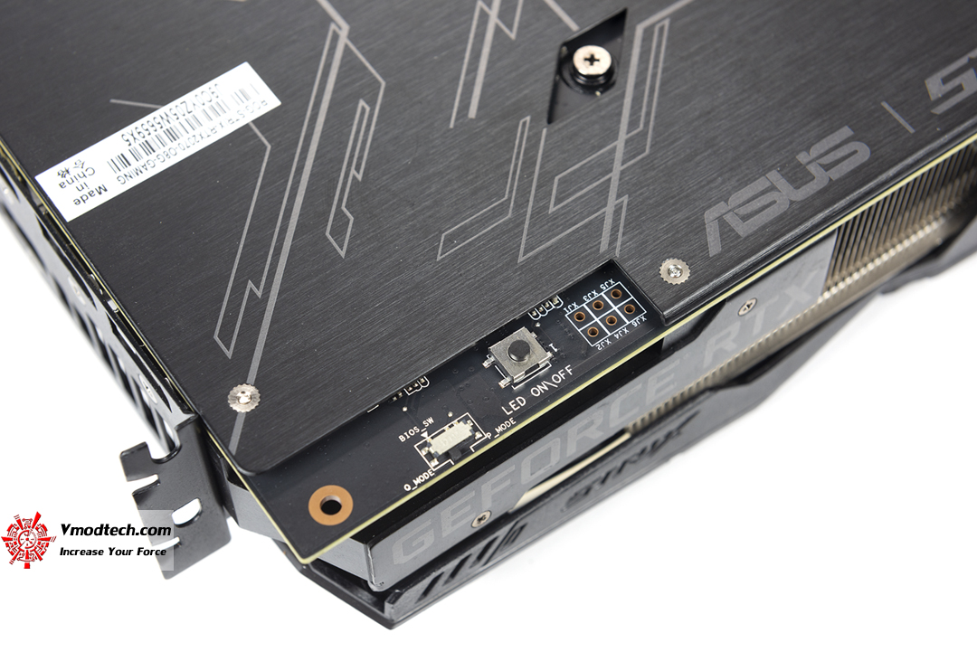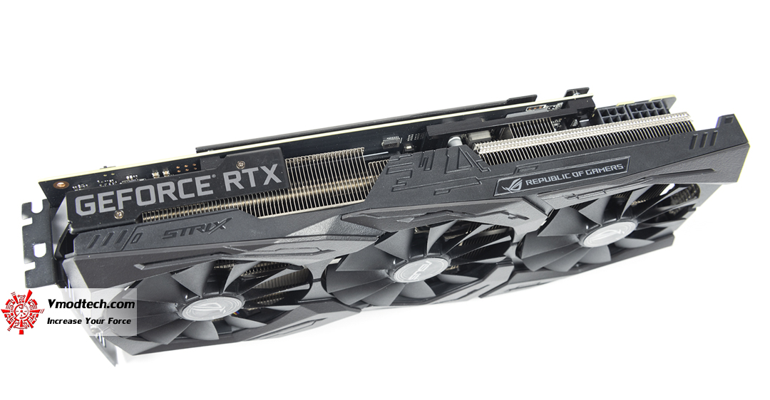 สันการ์ดนั้นจะมีโลโก้ซีรีย์ ASUS GeForce RTX ขาวเด่นชัดและโลโก้ Republic of Gamers ที่สามารถเปล่งแสงเมื่อเสียบใช้งาน ตัวการ์ดจะต้องการไฟเลี้ยงจากขั้วแบบ PCIe 8 พินจำนวน 1 หัวและ หกพินอีกหนึ่งครับ
