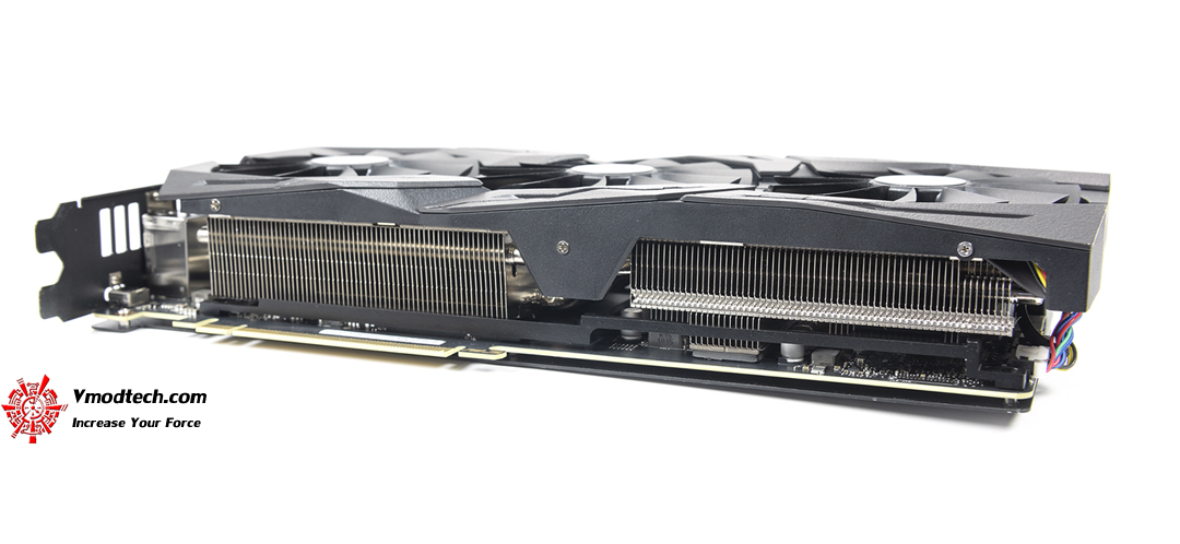 ในมุมนี้จะเห็นถึงความหนาของตัวการ์ดที่รวมชุดระบายความร้อนที่หนาประมาณ 2.2 สล๊อด ฟินระบายความร้อนจากมุมนี้นี่เห็นชัดเจนเลย พื้นที่ใหญ่มากรวมถึงสังเกตุคานเสริมความแข็งแรงด้วยครับ