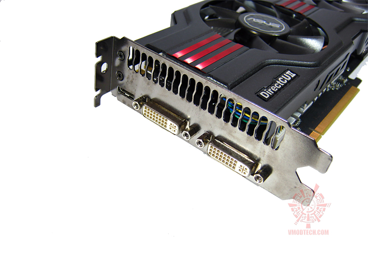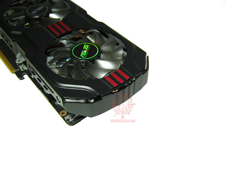 หันมาดูตัวการ์ดฯ กันบ้าง Asus GTX560 Ti DirectCUII TOP ตัวนี้ใช้แผง PCB สีดำ ตัวการ์ดฯ มีความหนากินพื้นที่ 2 สล๊อต กรอบครอบฮีตซิงค์ GPU เป็นอลุมิเนียมสีดำด้าน คาดลายเส้นตรง 3 เส้นสีแดง ดูดุดัน สวยงามดี และพกพัดลมระบายความร้อนขนาด 80 mm มาให้จำนวน 2 ตัว (เสียงจะดังมั๊ยเนี่ย…แต่ถึงจะดังก็ช่างมัน เอาสวยไว้ก่อน สำหรับผม : ) 555+)