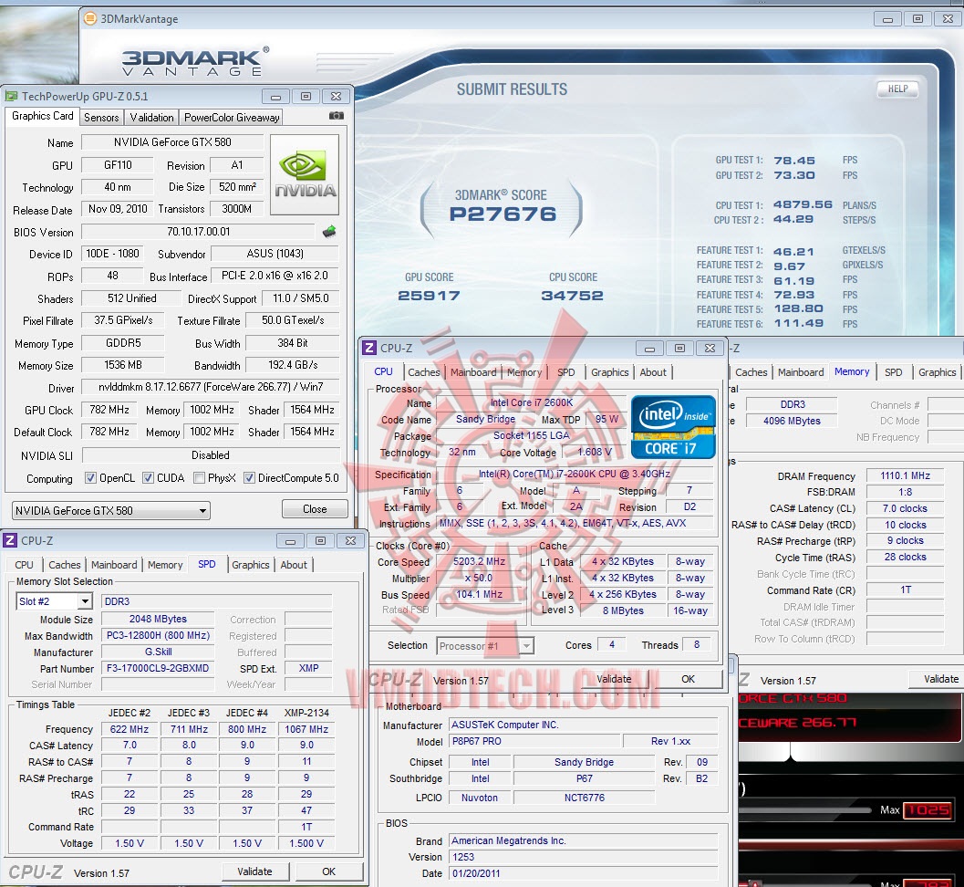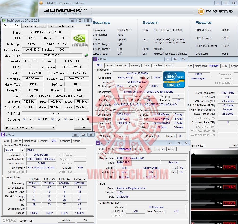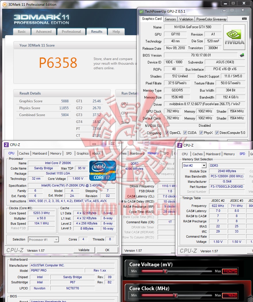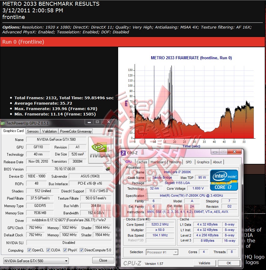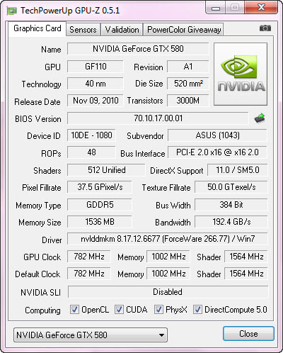 มาดูรายละเอียดจาก CPUZ ครับ สำหรับวันนี้ ผมจะทำการเทสที่สองค่า คือค่า Default 782/1002/1564 Core/Mem/Shader และ Overclock 950/1160/1900 Core/Mem/Shader สำหรับ Default ของ ASUS GTX580 นั้น จะทำการ Overclock กันมานิดหน่อยครับ คือ Standard จะเป็น Core 772 ส่วน ASUS จะเป็น 782.