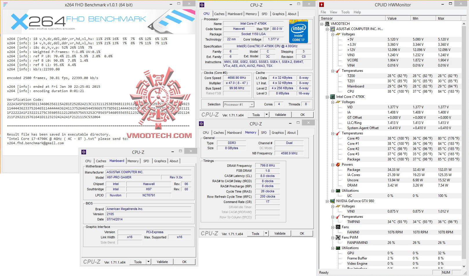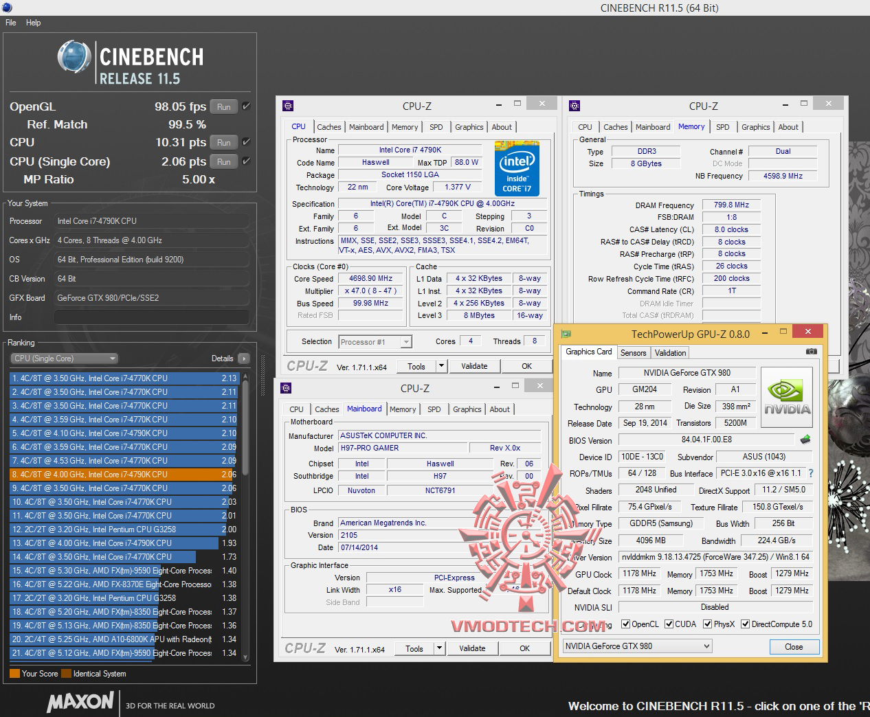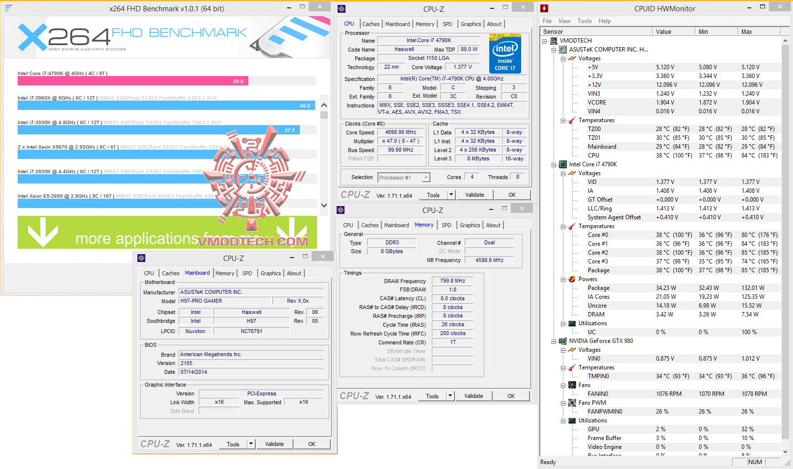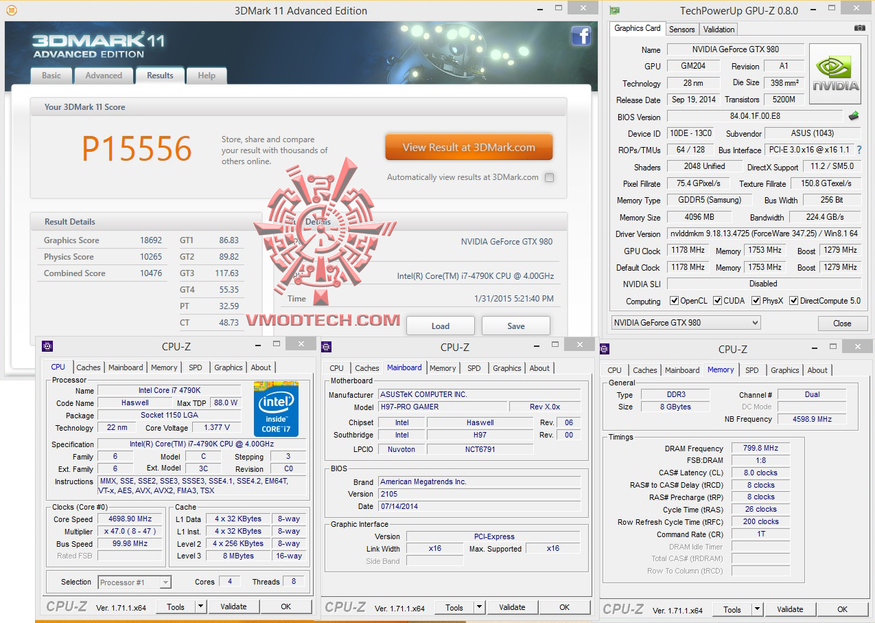 วันนี้ทดสอบที่ความเร็ว 4.7Ghz Vcore 1.37v NB Fre 4.6Ghz บัสแรม 1600Mhz 8-8-8-26-200 1T 1.65v ซึ่งในไบออสมีให้ปรับถึง 3000+ แต่ก็ใช้งานไม่ได้นะครับเพราะชิบเซ็ต H97 ก็จะดันบัสได้สูงสุดที่ 1600Mhz ตามสเปกข้างต้น ส่วนการ์ดจอใช้ ASUS GTX980 Poseidon ตัวแรงร่วมทำการทดสอบ