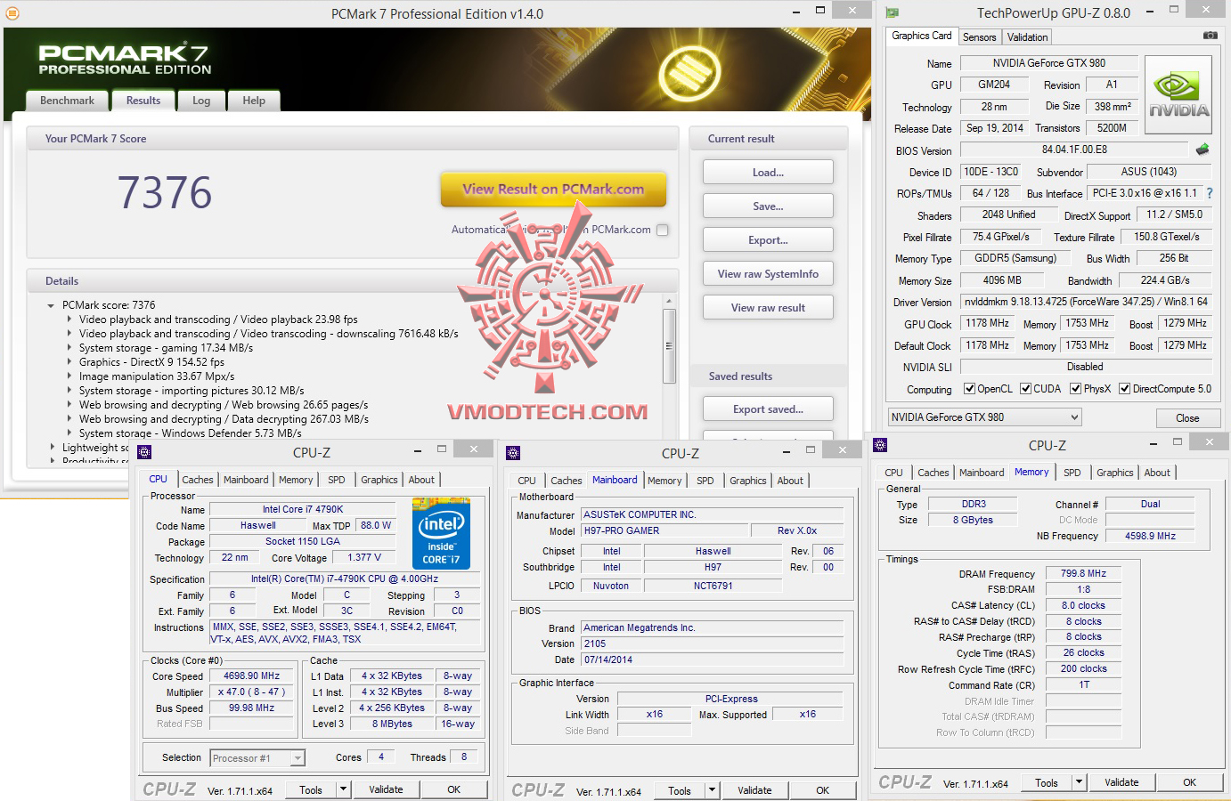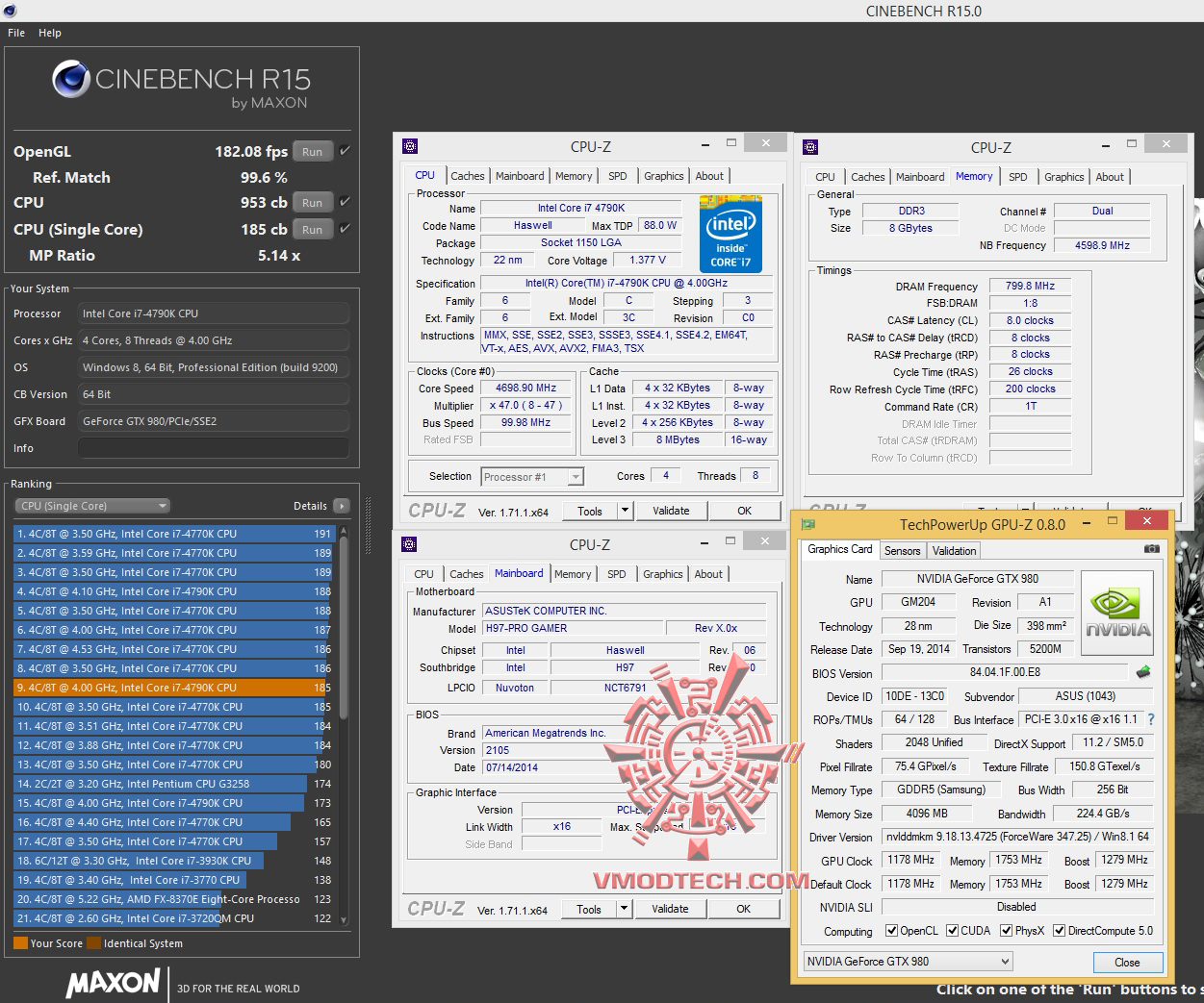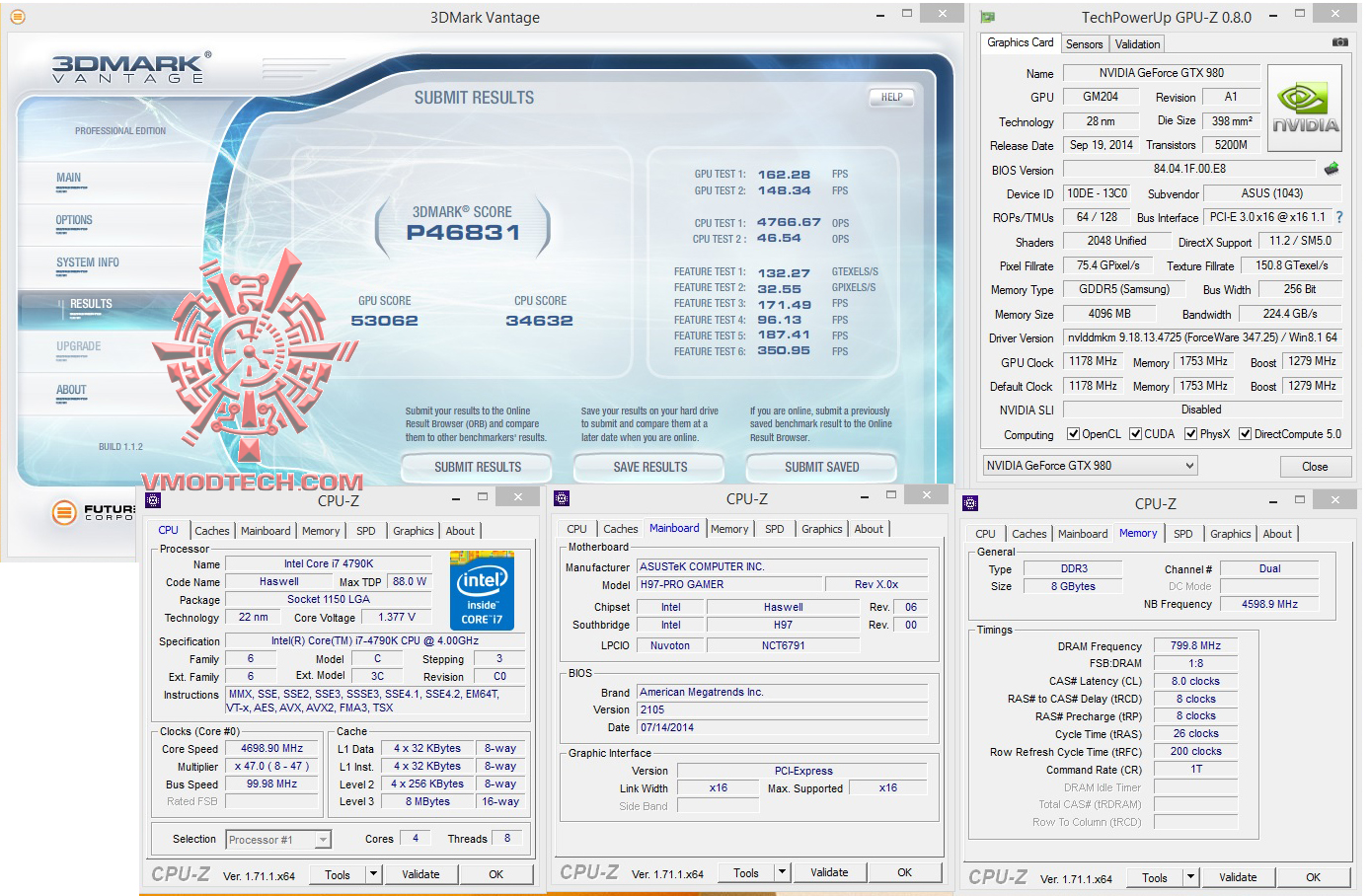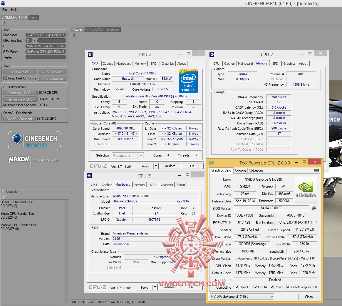วันนี้ทดสอบที่ความเร็ว 4.7Ghz Vcore 1.37v NB Fre 4.6Ghz บัสแรม 1600Mhz 8-8-8-26-200 1T 1.65v ซึ่งในไบออสมีให้ปรับถึง 3000+ แต่ก็ใช้งานไม่ได้นะครับเพราะชิบเซ็ต H97 ก็จะดันบัสได้สูงสุดที่ 1600Mhz ตามสเปกข้างต้น ส่วนการ์ดจอใช้ ASUS GTX980 Poseidon ตัวแรงร่วมทำการทดสอบ
