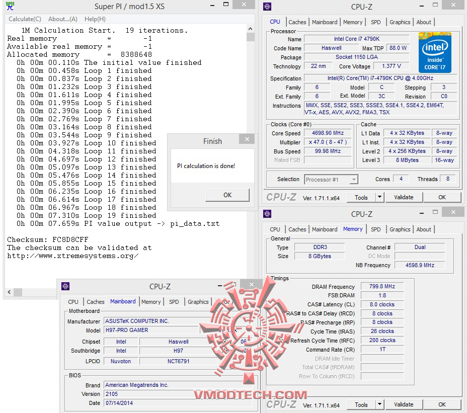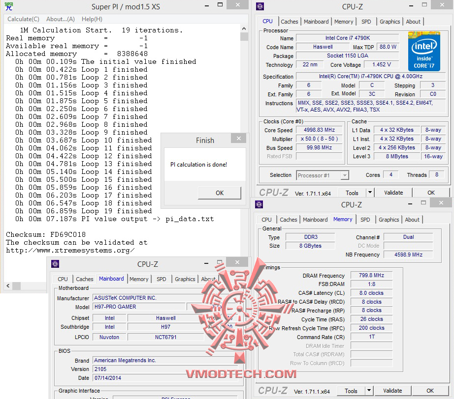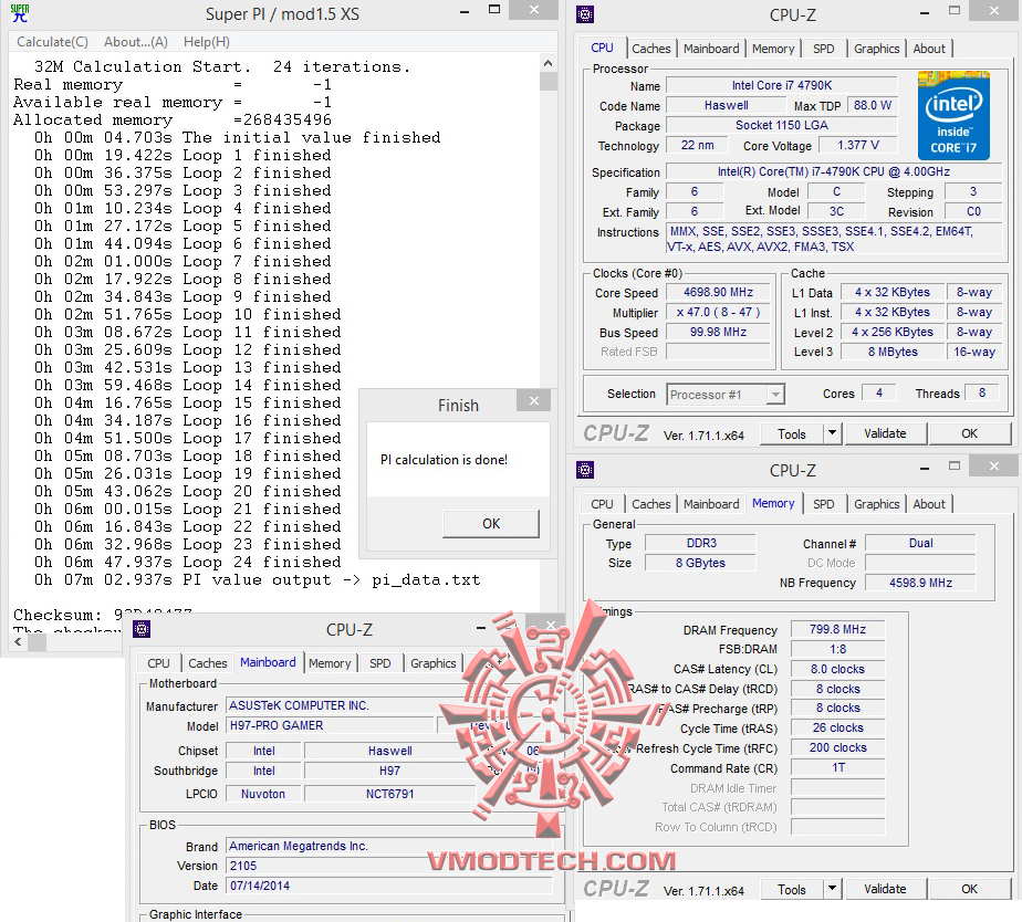 SuperPi 1MB อยู่ที่ 7.187 วินาที ถือว่าเร็วขึ้นมาเลยทีเดียวครับ ถ้าใครมีซีพียูวิ่งดีๆเกิน 4.7-5Ghz นี่สบายครับ ASUS H97-PRO GAMER พร้อมรับใช้ท่านอย่างเต็มที่แน่นอนในซิสเต็มแรงๆ