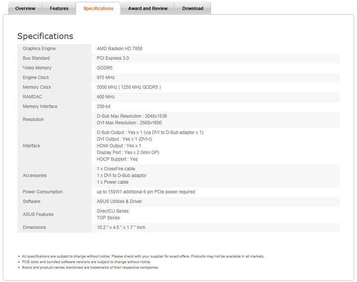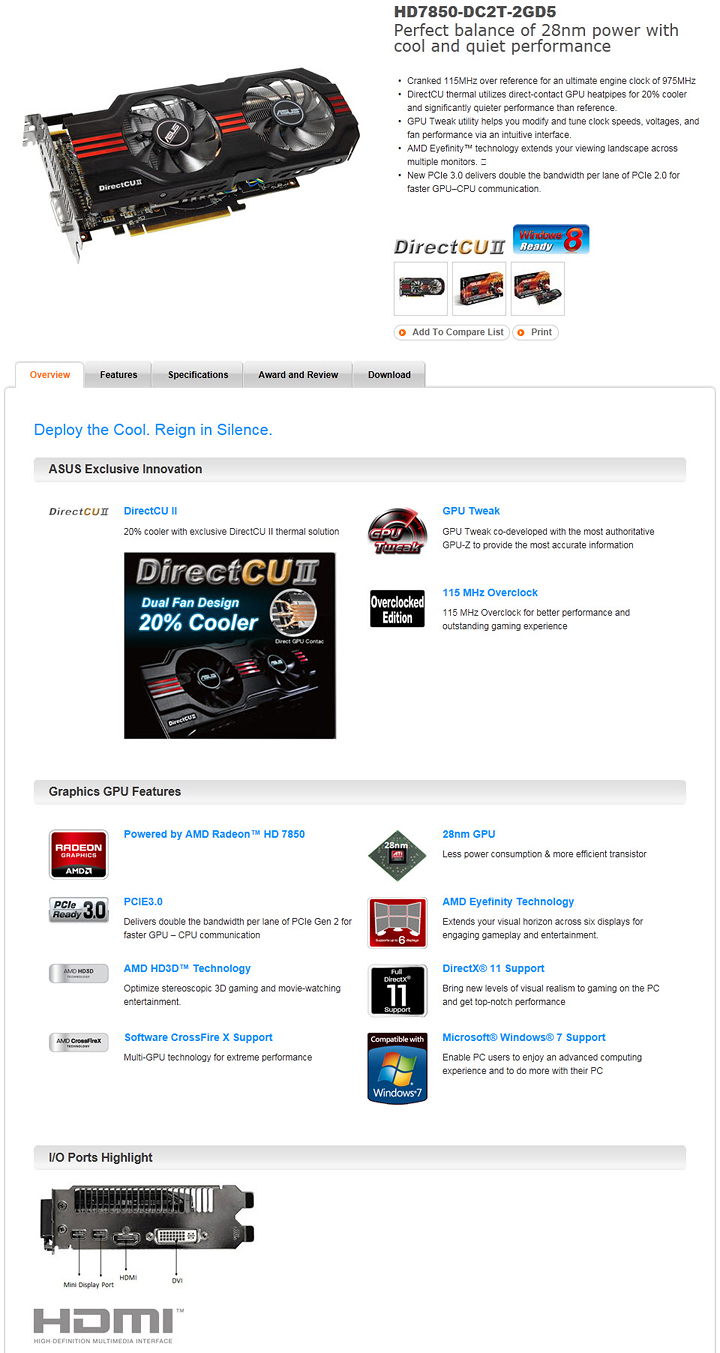 สำหรับการ์ด ASUS HD 7850 DirectCU II TOP ที่วางจำหน่ายนั้น จะมีเมมโมรี่ขนาด 2 กิ๊กกาไบท์แบบ GDDR5 มีแบนด์วิดท์ 256 บิท และมีความเร็วของ GPU สองสเต๊ปคือ ในเสต๊ปแรกคือ 975 MHz และจะสามารถบู๊ทไปได้ที่ 1050 MHz เลยครับ