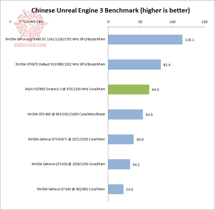 Benchmark Unreal Engine 3 ซึ่งเป็นโปรแกรมที่รันบน DX 11 อีกตัวนึง ASUS HD 7850 DirectCU II TOP ทำผลงานได้ 64.3 เฟรมต่อวินาทีครับ