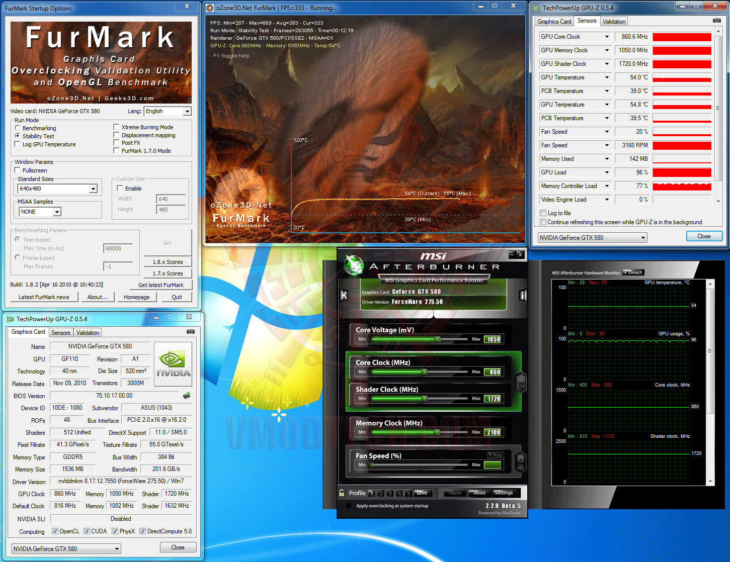 …กับรอบพัดลมที่ปรับสูงสุดได้ที่ 100% และใช้ไฟเลี้ยงเดิมๆที่ให้มาที่ 1,050mV และโอเวอร์คล็อคกันไปที่ 860/1,720/4,200MHz อุณหภูมิสูงสุดจะอยู่ที่ 55องศาเซลเซียส เพียงเท่านั้นนะครับ เย็นดีมากๆเลยครับ เสียงพัดลมที่ปรับรอบสุดขนาดนี้ก็ดังขึ้นมาในระดับพอสมควรครับ