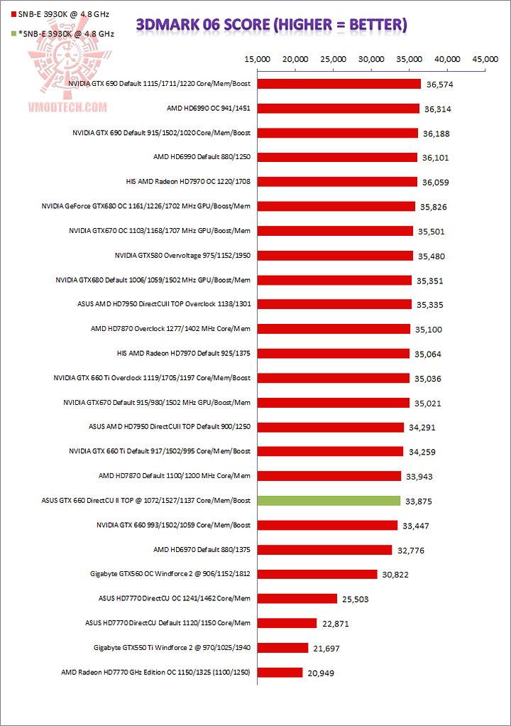 จากกราฟเลยนะครับ สำหรับ 3DMark 06 บน Platform LGA 2011 นั้น ASUS GeForce GTX 660 DirectCU II TOP ได้คะแนนสูงมากถึงสามหมื่นสามพันกว่าๆ แต่หลังจากที่ได้ทำการโอเวอร์คล๊อกไปแล้วก็พบว่า คะแนนลดลง อย่างที่ทราบกันแล้วครับว่า 06 นั้นเป็น Benchmark ที่ออกมานานแล้วและมีคอนฟลิกกับระบบ Turbo Boost ของ Nvidia เลยไม่ได้เอามาโชว์ครับ