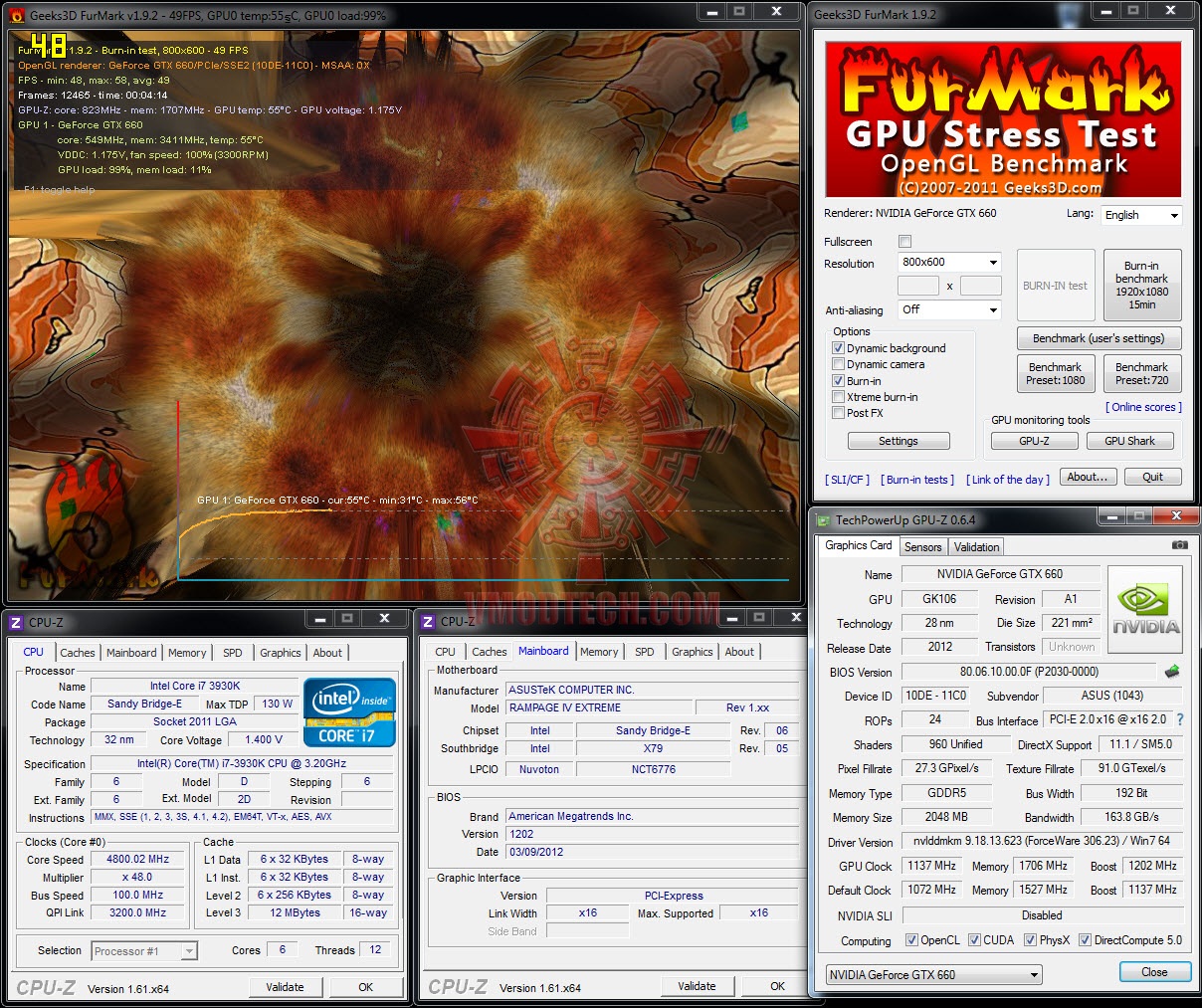อุณหภูมิของการ์ด .ASUS GeForce GTX 660 DirectCU II TOP ขณะ Furmark นั้นจะอยู่ที่ไม่เกิน 66 องศาครับบนรอบพัดลมทำงานแบบออโต เสียงเงียบสมกับเป็น DirectCU II เลย