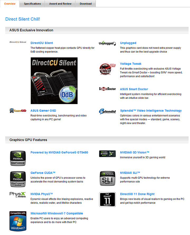 Spec ของ ASUS GTS 450 DirectCU Silent นั้นก็ไม่ได้แตกต่างจากมาตรฐานครับ แต่สิ่งที่พิเศษคือ Heatsink นั่นเอง