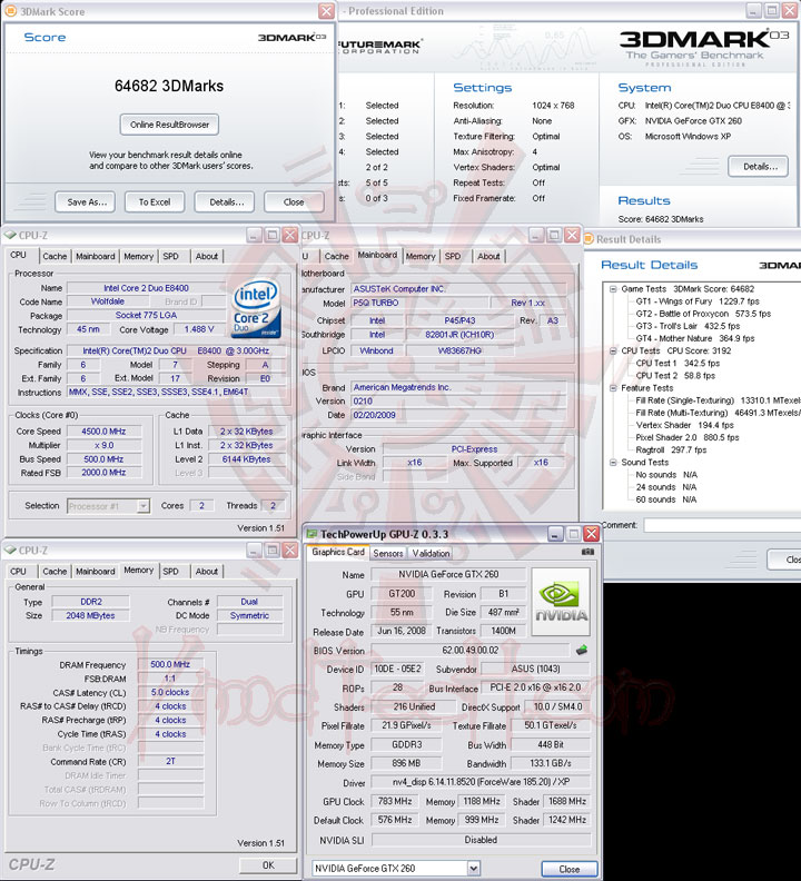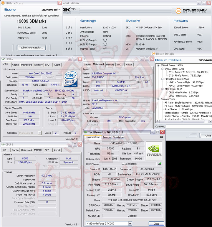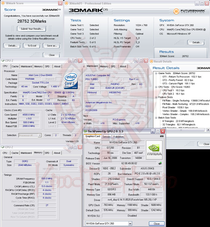 มาถึงในช่วงของการทดสอบประสิทธิภาพจากโปรแกรมเบนซ์มาร์คกันบ้างครับ ครั้งนี้เปลี่ยนมาใช้ CPU Intel E8400 ทดสอบบนระบบระบายความร้อนด้วยอากาศ ห้องไม่ติดเครื่องปรับอากาศเช่นเคยนะครับ อุณหภูมิโดยรอบเฉลี่ย31-32องศาเซลเซียส กราฟฟิกการ์ดเลือกใช้ ASUS ENGTX260 Matrix ที่เคยทดสอบให้ได้ชมกันมาแล้ว หน้าตาซิสเตมที่ใช้ดังรูปด้านล่างเลยครับ