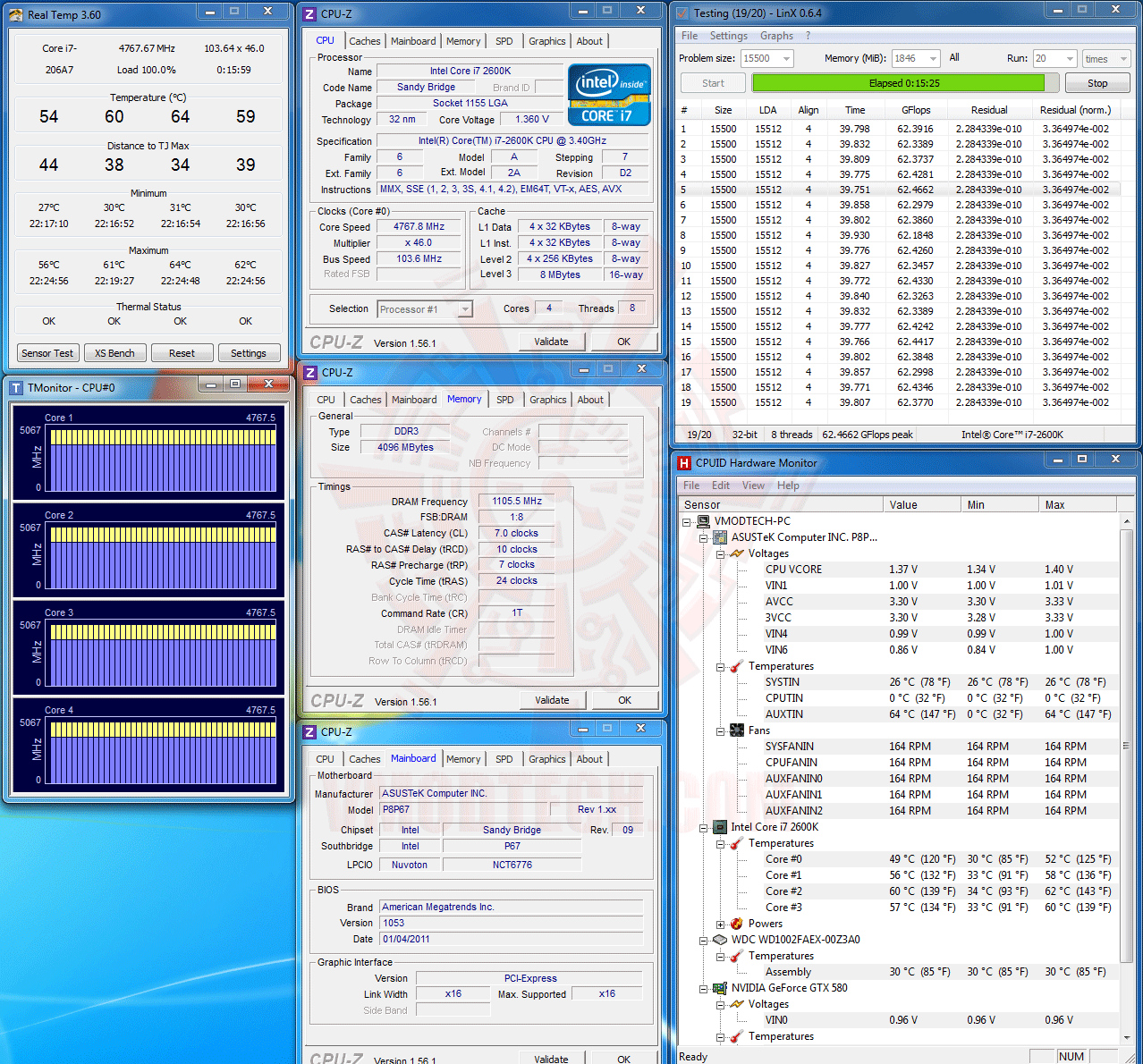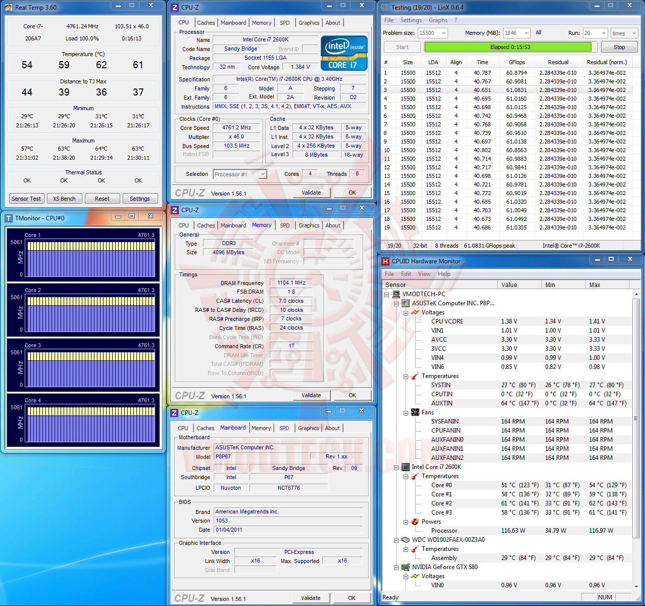 …ปิดท้ายกันด้วยการอัดแบบหาค่า Max Stable BClk ซึ่งผมลองดูแล้วที่ BClk 104MHz จะไม่บูต แต่มา103MHz ก็จะบูตเข้าวินโดว์ได้ปรกติดี ก็จัดการไล่หา BClk ที่เสถียรพอจะเทสต์ LinX ผ่าน ก็มาจบที่ค่า 103.6MHz นะครับ ซึ่งกับความแรงขนาดนี้ก็เป็นอีกทางเลือกที่น่าใช้ดี เพราะว่าใช้ไฟเลี้ยงซีพียูที่ต่ำ สูงสุดเพียงไม่เกิน 1.4V. ก็เลยทำให้ระบบโดยรวมเย็นขึ้นกว่าเดิมแบบเห็นๆ แถมยังแรงด้วยแรมที่วิ่งด้วยความเร็วสูงถึงระดับ DDR3-2211 7-10-7-24-1T กันอย่างมีเสถียรภาพอีกต่างหาก