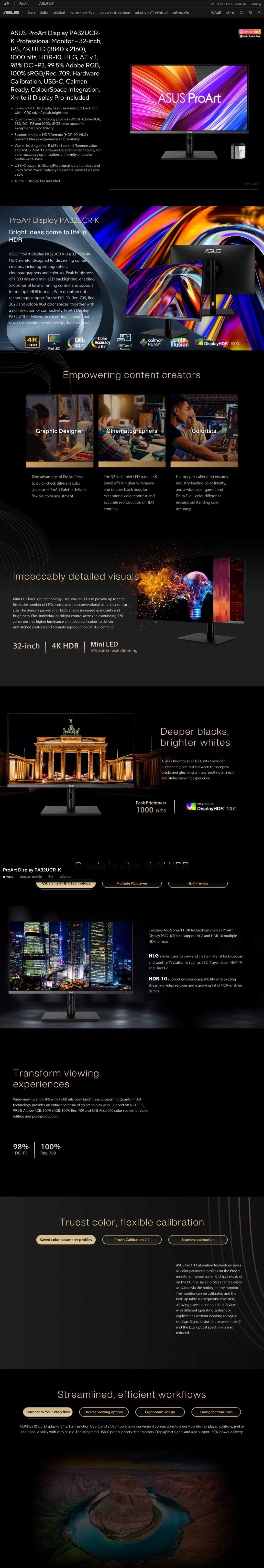 สวัสดีครับ วันนี้เรามีจออีกรุ่นจากแบรนด์ ASUS มารีวิวกันอีกเช่นเคยครับและจะยังมีอีกหนึ่งรุ่นหลังจากนี้ รุ่นที่เราจะพูดถึงในวันนี้ก็คือ ASUS ProArt Display PA32UCR-K ซึ่งเป็นจอขนาดใหญ่สำหรับการทำงานที่สมบูรณ์แบบเลยทีเดียวครับ โดยตัวจอนั้นเป็นจอ LED มอนิเนอร์ที่มีความละเอียด 3840 × 2160 ระดับ 4K หรือ UHD ตัวพาแนลเป็นแบบ IPS ที่สามารถให้สีสรรเที่ยงตรง และตัวจุดกำเนิดแสงนั้นจะเป็นแบบ Mini-LED อัตราส่วนจออยู่ที่ 16:9 มีขนาด 32 นิ้ว ตัวจอนี้นั้นตอบสนอง Color Space (sRGB) : 100%, Color Space (Adobe RGB) : 99.5%, Color Space (DCI-P3) : 98%, Color Space (Rec.2020) : 87% ตามสเปกที่ตอบสนองได้นี้ถือเป็นตัวที่สุดเหมือนกันนะครับ และยังรวมถึงรองรับ HDR10 และ HLG ด้วย เอาเป็นว่าเรามาชมรายละเอียดต่างๆกันต่อเลย