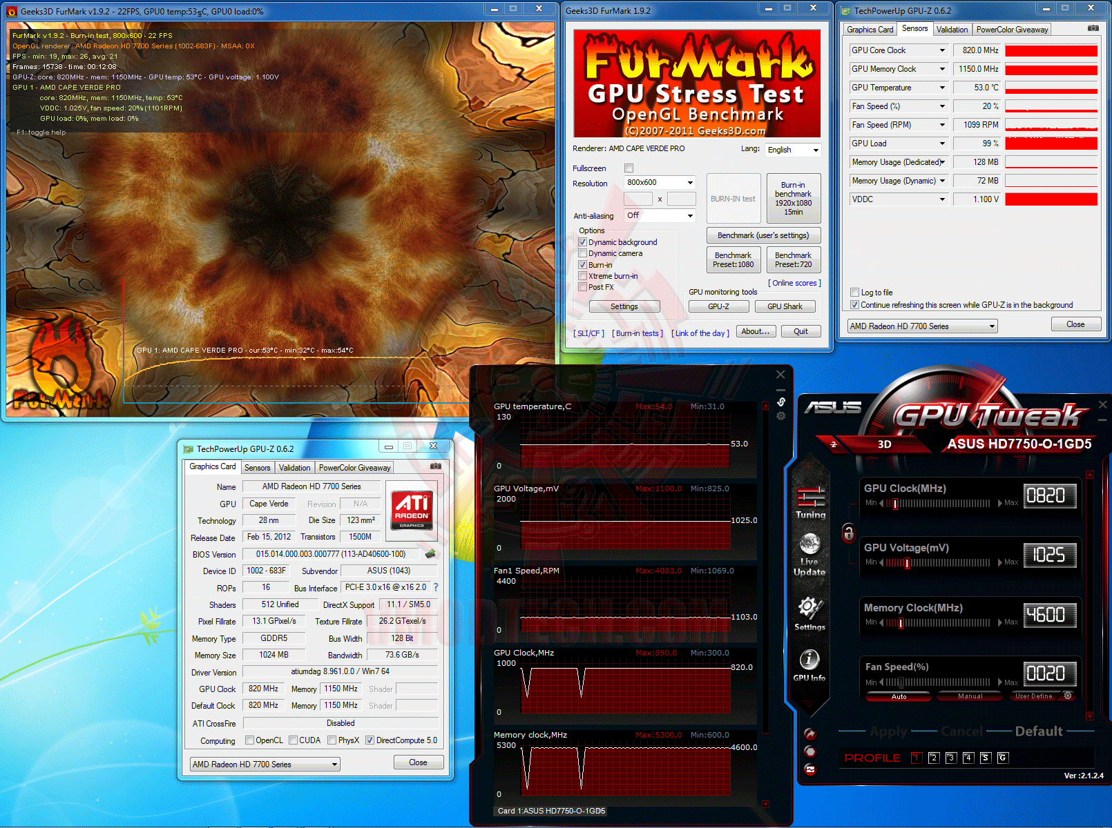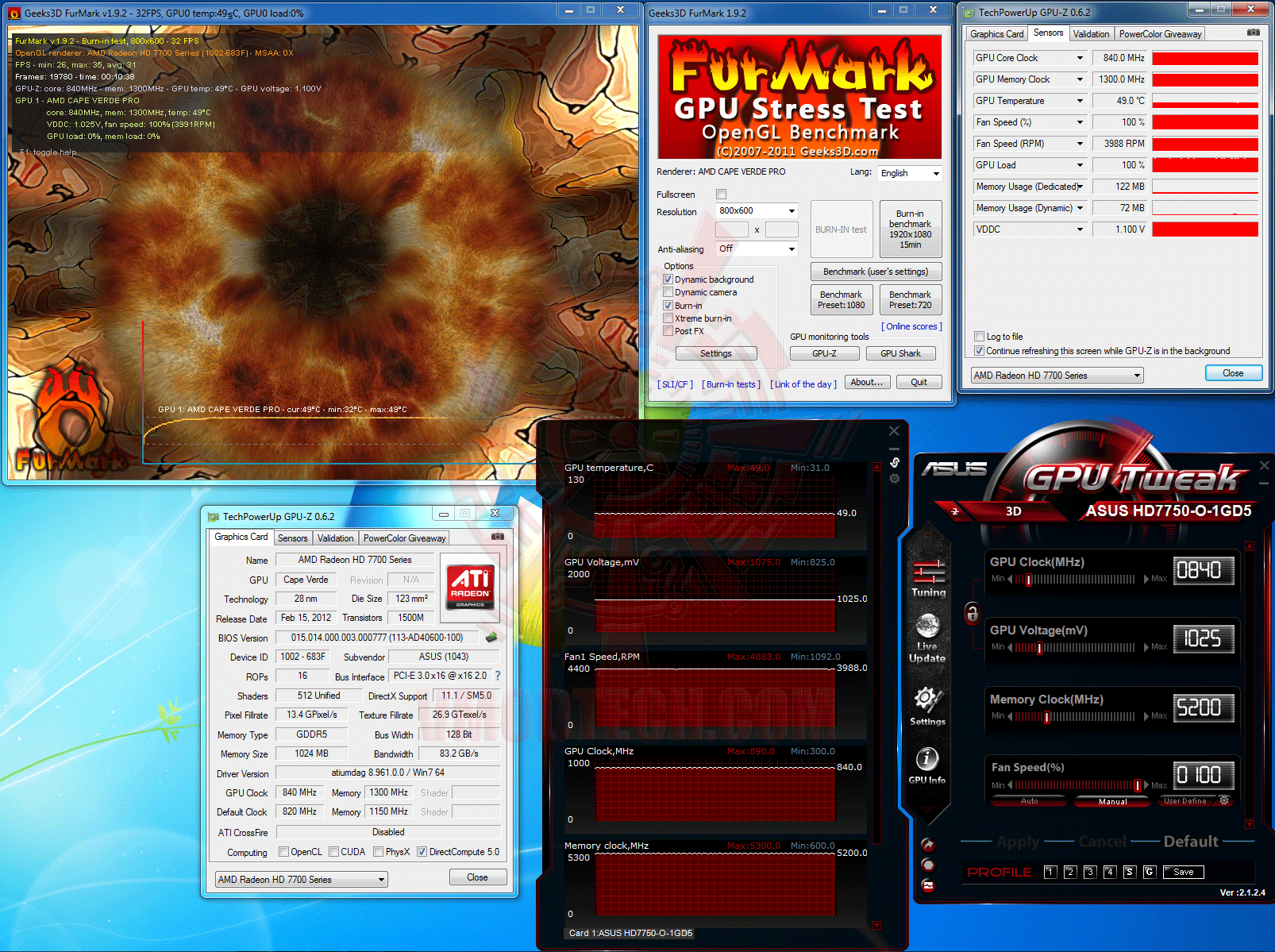 …ตามด้วยการเปิดพัดลมรอบสุดที่ 100% และลากความเร็วเพิ่ม ก็ไปจบกันที่ความเร็ว 1,125/6,300MHz หมดแม็กโปรแกรมที่ลากด้วยไฟเลี้ยงเดิมๆกันอย่างมีเสถียรภาพ และอุณหภูมิที่ร้อนสูงสุดแค่ 59 องศาเซลเซียสเพียงเท่านั้น
