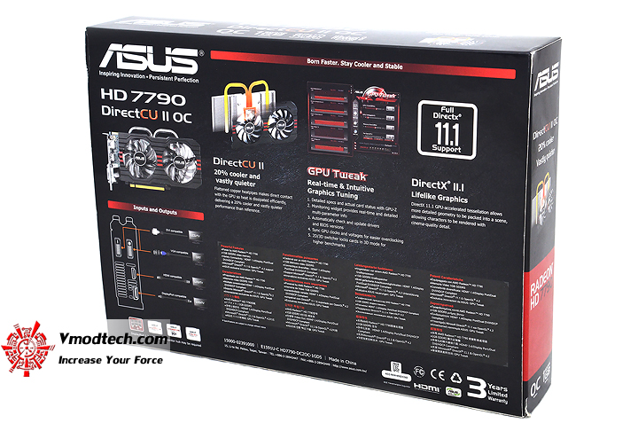 รายละเอียดด้านหลังแสดงให้เห็นถึงฟีเจอร์หรือคุณสมบัติหลักๆของกราฟฟิกการ์ด ASUS RADEON HD7790 DirectCU II OC ไม่ว่าจะเป็นระบบระบายความร้อน DirectCU II, Software GPU Tweak ที่สามารถใช้ทำการโอเวอร์คล๊อกได้ รวมถึงรองรับการทำงานของ DirectX 11.1 อย่างเต็มรูปแบบ