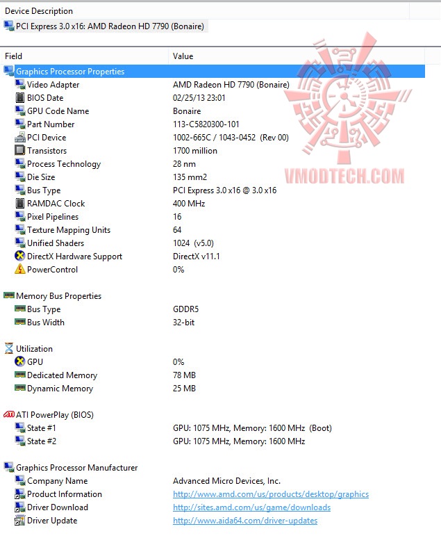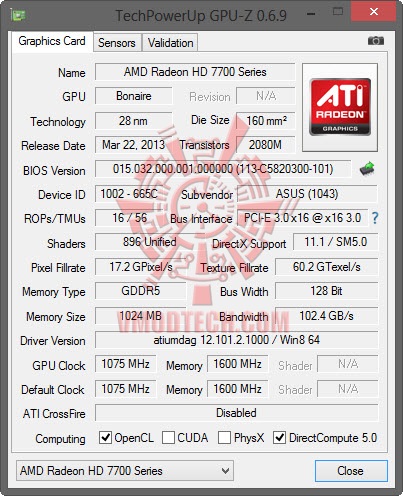 ความเร็วมาตรฐานของ ASUS RADEON HD7790 DirectCU II OC นั้นคือ 1075/1600 MHz Core/Mem ซึ่งเป็นความเร็วที่ได้รับการโอเวอร์คล๊อกคอร์มาแล้วจากโรงงาน 75 MHz และ 100 MHz เพิ่มเติมในส่วนของแรมครับ ตัวการ์ดพกแรมแบบ GDDR5 ที่มีขนาด 1 Gigabyte