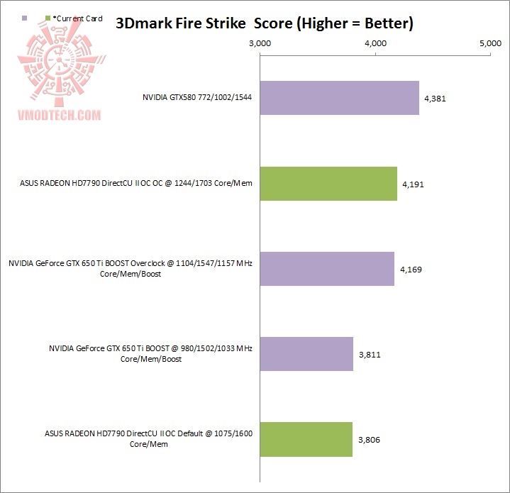 สำหรับ 3DMark เวอร์ชั่นที่ออกมาในปี 2013 นี้ เราพิจารณาที่ Fire Strike จะเห็นได้ว่า ASUS RADEON HD7790 DirectCU II OC ประสิทธิภาพและความแรงสูสีกับ GTX650 Ti Boost เลยครับ