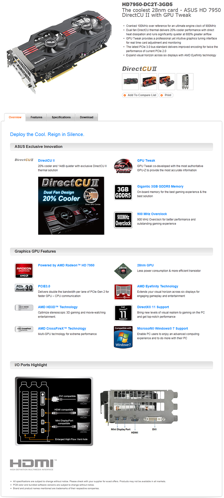 มาแล้วครับสำหรับรีวิวกราฟฟิกการ์ดที่ร้อนแรงที่สุดในช่วงต้นปี 2555 นี้ เป็นยี่ห้อใดไปไม่ได้ครับมันต้องเป็นการ์ดจาก AMD Radeon นั่นเอง หลังจากที่ตัวผมเองก็รอมาแสนนานพอควรครับ วันนี้ได้จับตัวเป็นๆ ได้สัมผัสกับความแรงของมัน โดยวันนี้ได้รับ ASUS Radeon HD7950 DirectCUII TOP รหัสของการ์ดตัวนี้คือ HD7950-DC2T-3GD5 ซึ่งในซีรีย์นี้จากค่าย ASUS นั้น ได้แบ่งระดับของการ์ดไว้สามระดับคือ การ์ดมาตรฐาน, DirectCUII, และ DirectCUII TOP ซึ่งความต่างในสองตัวหลังก็คือเรื่องของ Clock ที่ตัว TOP นี้จะมากกว่าตัวธรรมดาอยู่ 100 MHz นั่นเอง