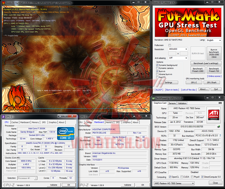 สำหรับความร้อนของการ์ดในตระกูล DirectCUII ของทาง ASUS นั้น ความร้อนผมมองว่ามันอาจจะร้อนมากกว่าการ์ดที่เป็นลักษณะ Non Ref ซักนิดครับ เท่าที่ผมเข้าใจคือมันเป็นการ์ดที่โมภาคจ่ายไฟมาอย่างเต็มที่ ให้พร้อมรับกับการถอด Heatsink แล้วนำไปติด Pot เพื่อที่จะเล่นกับของเย็นอื่นๆไม่ว่าจะเป็น Dry Ice หรือว่า LN2 ดังจะเห็นได้ว่า World Record นั้น การ์ดจากซีรีย์นี้กินเรียบหมด วนกลับมาที่ความร้อนขณะ Full Load หลังจาก Overclock นั้น บอกตามตรงว่ามันยังวิ่งไม่หยุดเลยครับ ขณะที่จับภาพนั้น อุณหภูมิจะไปอยู่ที่ 63 องศาครับ แต่วัยรุ่นขี้เกียจรอเลยเอาแค่นี้แล้วกัน อ้อ วันนี้ผมลืมจับกำลังไฟขณะใช้งานนะครับ ต้องขอโทษอีกที คราวหน้าไม่ลืมแน่นอน อิอิ กำ