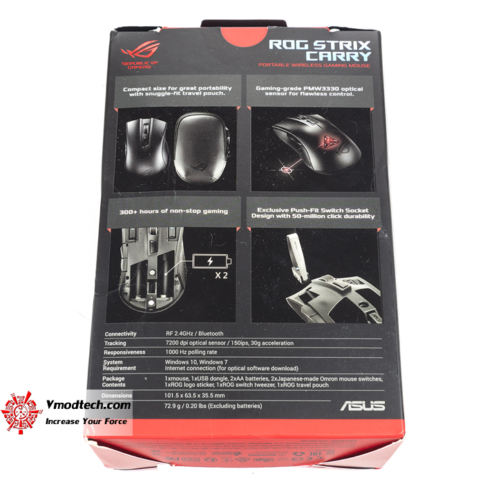หน้าตากล่องบรรจุของ ROG STRIX Carry นั้นออกแบบมาแบบเรียบๆ ด้านหลังมีรายละเอียดด้านเทคนิคของตัวเมาส์อยู่อย่างครบถ้วนเลย