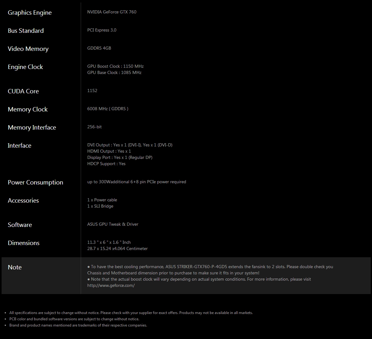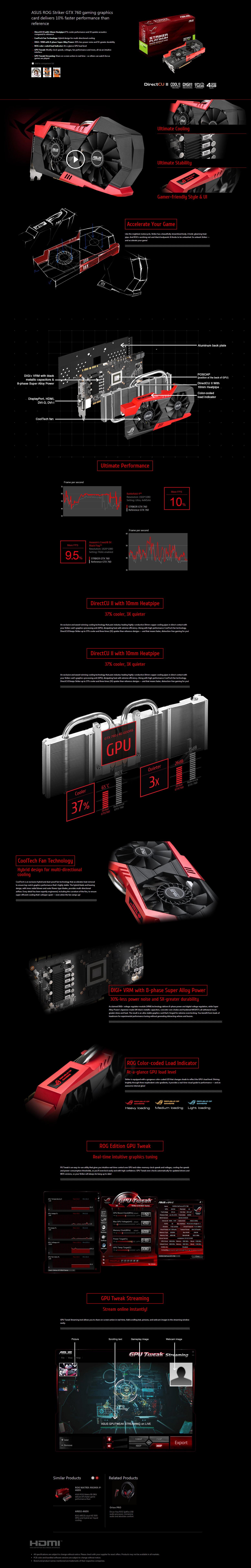 ……….สวัสดีครับ วันนี้ มาพบกับกราฟิกการ์ดรุ่นกลางๆหน้าตางามๆ กันบ้างครับกับ ASUS ROG Geforce GTX 760 Striker Platinum ใครที่ชอบอะไรที่มากกว่ากราฟิกการ์ด วันนี้ถูกใจแน่นอนครับ ซึ่งเจ้า ASUS ROG Geforce GTX 760 Striker Platinum เป็นหนึ่งในตละกูล Republic of Gamers หรือว่า ROG. ของทาง Asus ซึ่งอย่างที่รู้กันว่า ROG. นั้นเป็นงานในระดับ Hi-end การที่ Asus จับกราฟิกการ์ดระดับกลางๆอย่าง GTX 760 มาอยู่ในระดับไฮคราสอย่างนี้นั้นทำให้น่าสนใจเป็นพิเศษ ใครที่ชอบความสวยหรูมีระดับในราคาที่พอจะจับต้องได้ ต้องไม่พลาดครับงานนี้ ก่อนอื่นต้องขอเชิญชมรายละเอียดจากเว็บไซค์ผู้ผลิตกันก่อนเลยครับ