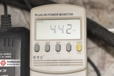 และเมื่อตรวจสอบกำลังไฟที่ระบบเรียกจากเต้ารับนั้นจะเห็นว่าพุ่งไปมาแถวๆเกือบๆ 450 วัตต์เท่านั้นครับ
