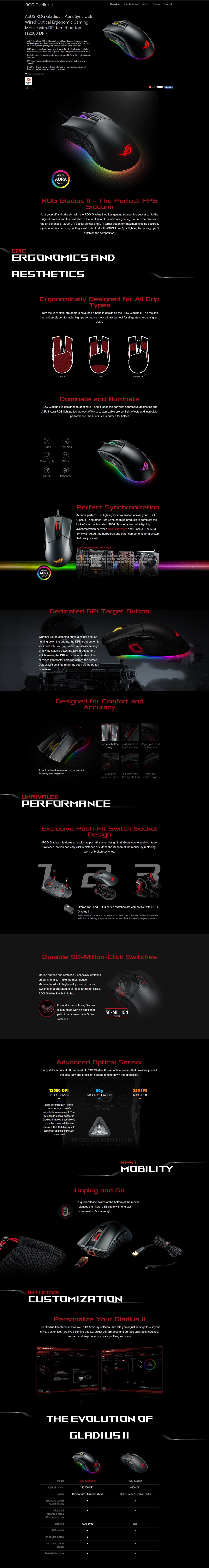 สวัสดีครับ วันนี้เรามีเกมส์มิ่งเกียร์รุ่นใหม่ล่าสุดจากแบรนด์ ASUS มาให้ได้ชมกัน ASUS นั้นถือเป็นผู้ผลิตที่พัฒนาผลิตภัณฑ์ของตัวเองอย่างต่อเนื่องทั้งสายคอมโพเน้นท์และเกมส์มิ่งเกียร์วันนี้เรามีเมาส์รุ่นใหม่ล่าสุดที่ชื่อ ASUS ROG Gladius II มารีวิวให้ได้ชมกัน ROG Gladius II นั้นเป็นเมาส์แบบ Optical มีความละเอียดสูงสุดที่ 12000 DPI มี Aura Sync RGB ที่สามารถปรับแต่งให้แสดงสีสรรต่างกันสามจุดและยังสามารถแสดงสีสรรสอดคล้องร่วมกันกับอุปกรณ์อื่นๆเช่นคีย์บอร์ดหรือเมนบอร์ดได้ด้วย เรามาชมรายละเอียดกันเลยครับ