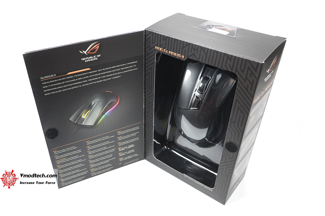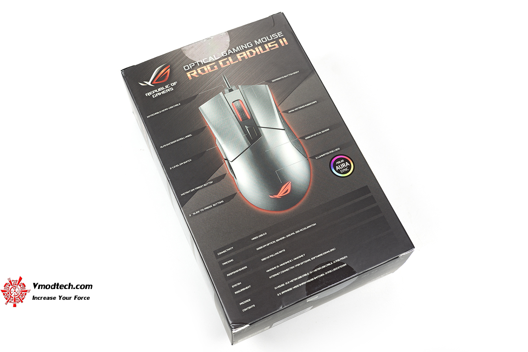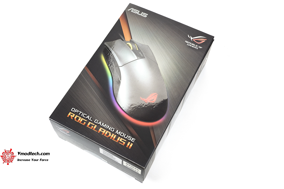 กล่องบรรจุตัว ASUS ROG Gladius II นั้นได้รับการออกแบบมาให้สวยงามสีสรรจี๊ดจ๊าดทีเดียว ด้านหน้าและด้านหลังได้บรรยายรายละเอียดของจุดเด่นต่างๆเอาไว้