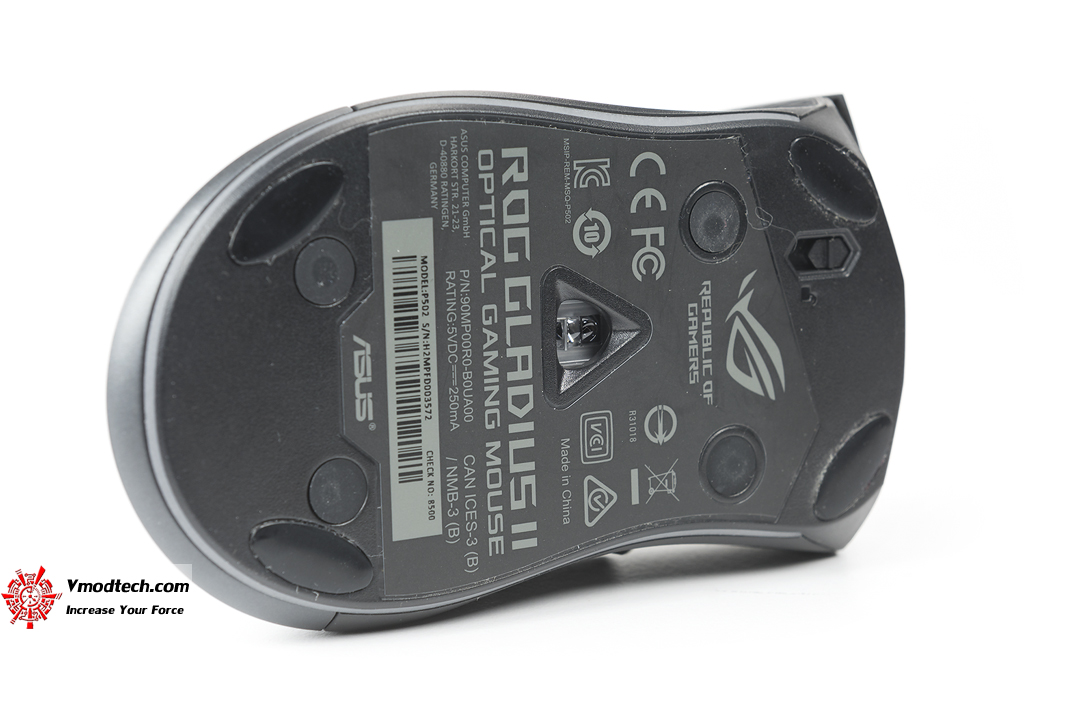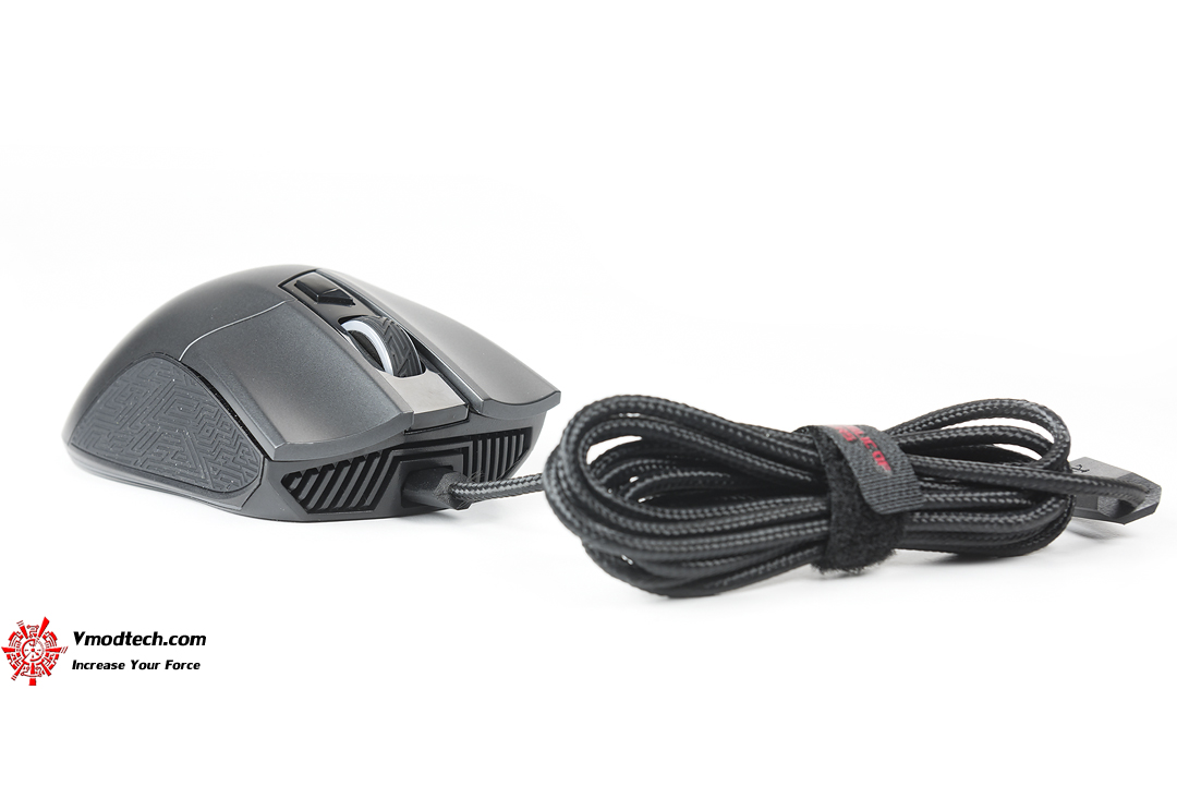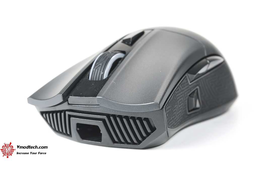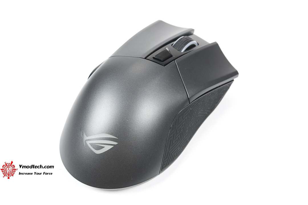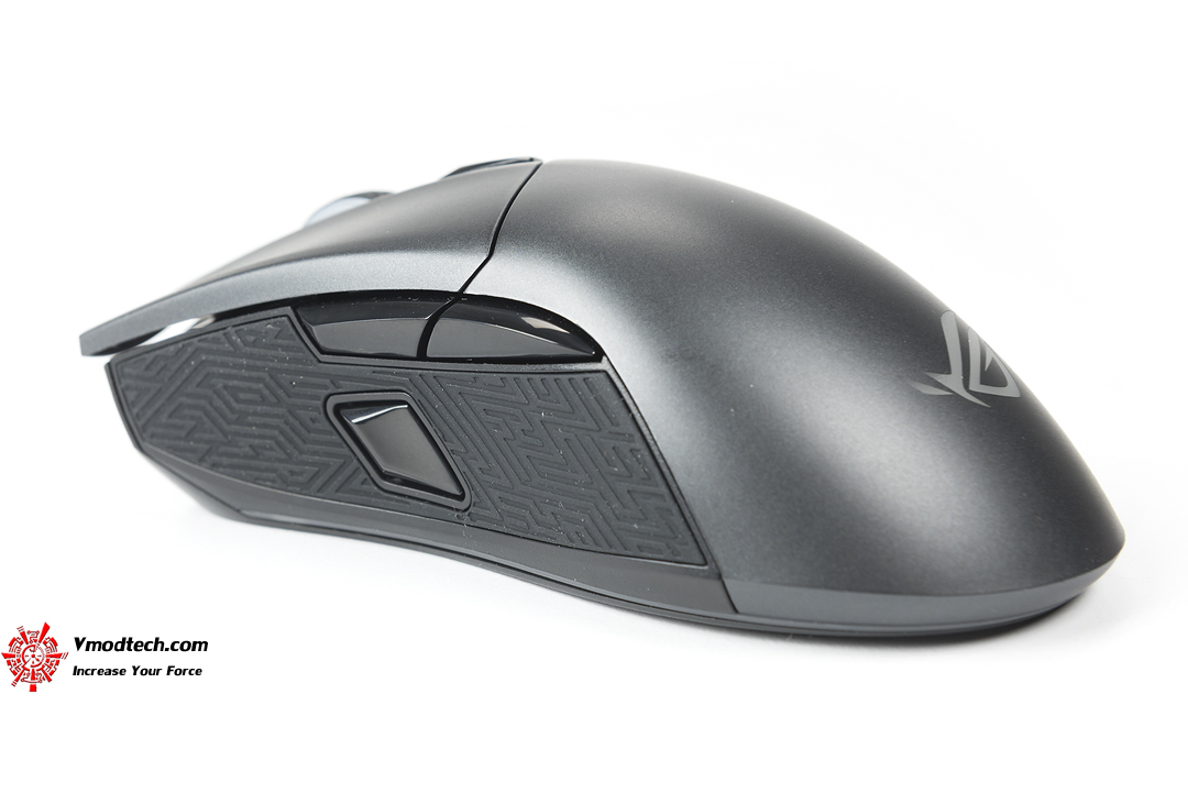 ด้านข้างนั้นจะมียางขึ้นลายสวยงามมากช่วยให้การจับเมาส์นั้นกระชับ ด้านบนจะเป็นปุ่มสามปุ่ม ซึ่งสามารถปรับได้ว่าจะให้ทำงานหน้าที่อะไร