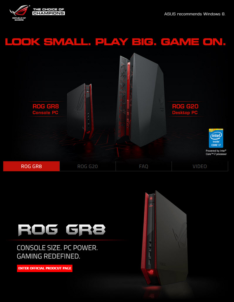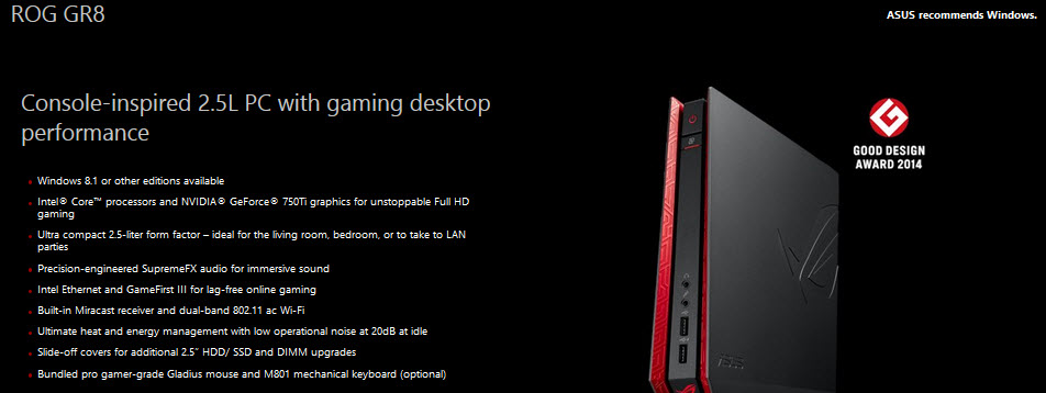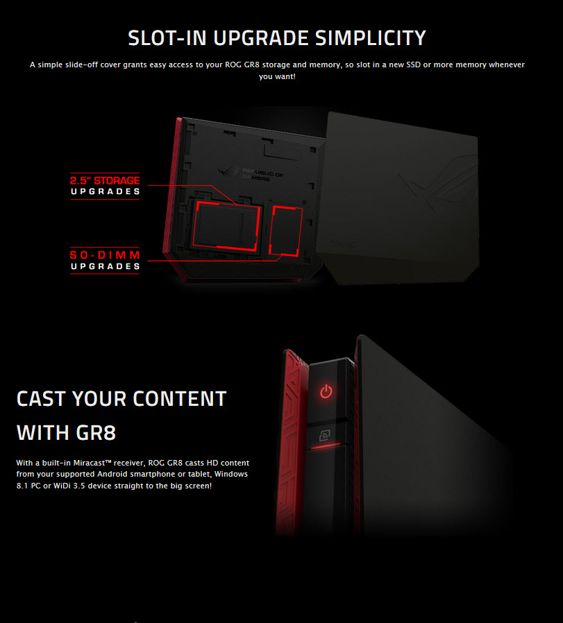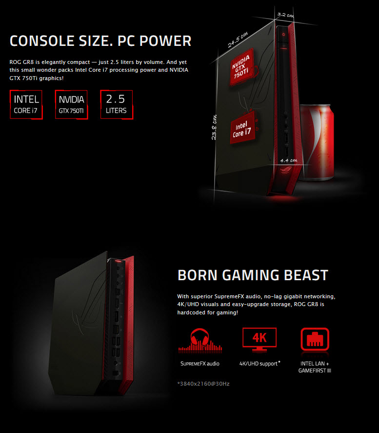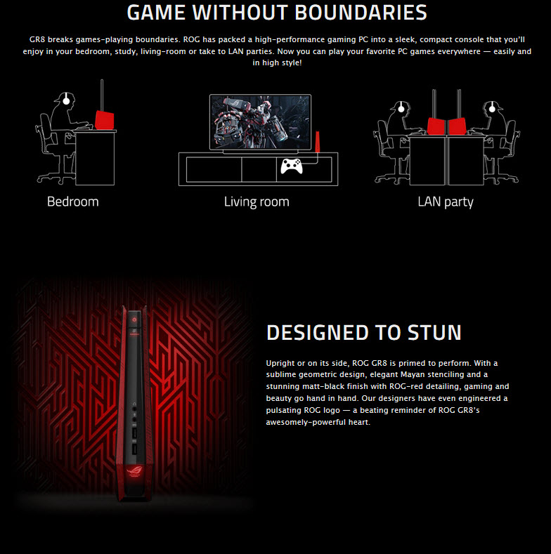 ASUS ROG GR8 นั้นออกแบบมาให้มีขนาดเล็กเพียง 2.5 ลิตร ที่เหมาะกับการใช้งานในห้องรับแขก ห้องนอนหรือจะหอบหิ้วไปเล่นเกมส์กับเพื่อนก็ย่อมได้