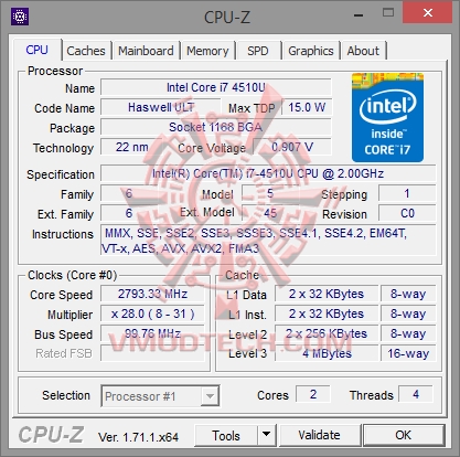 CPU นั้นได้เลือกติดตั้ง Intel Core i7 4510U สำหรับโมไบล์ ที่มี 2 คอร์ 4 เธรด มีแคช L3 ขนาด 4 เมกกะไบท์