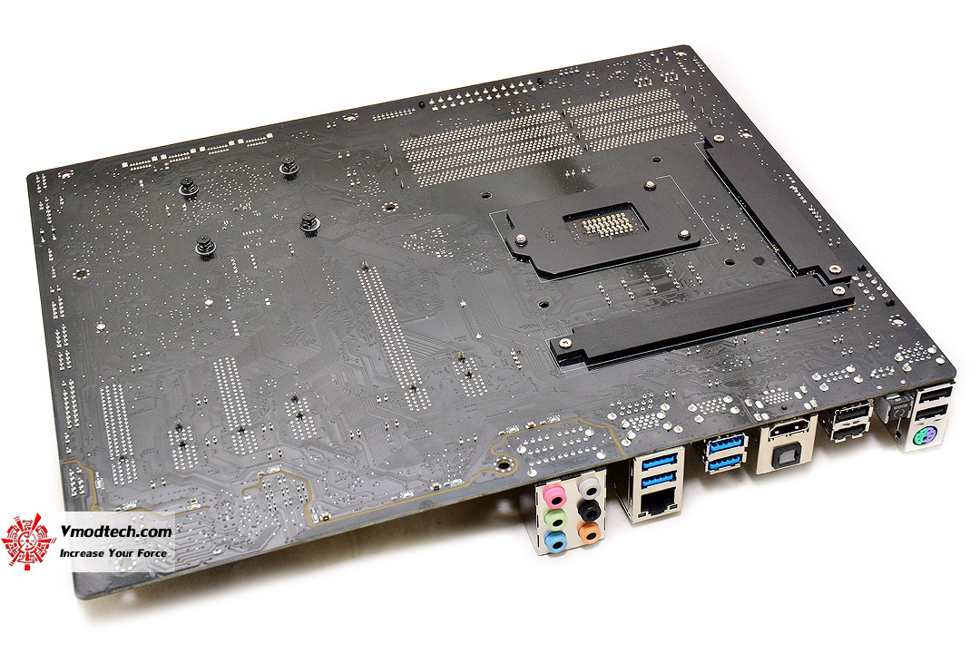 …ด้านหลังบอร์ดหรูหราด้วยผิว pcb ดำมันเงาเช่นเดียวกับด้านหน้าครับ แถมยังมีแผ่นซิงค์ระบายความร้อนให้ภาคจ่ายไฟด้านหลังด้วยครับ ใส่ใจทุกรายละเอียดจริงๆ