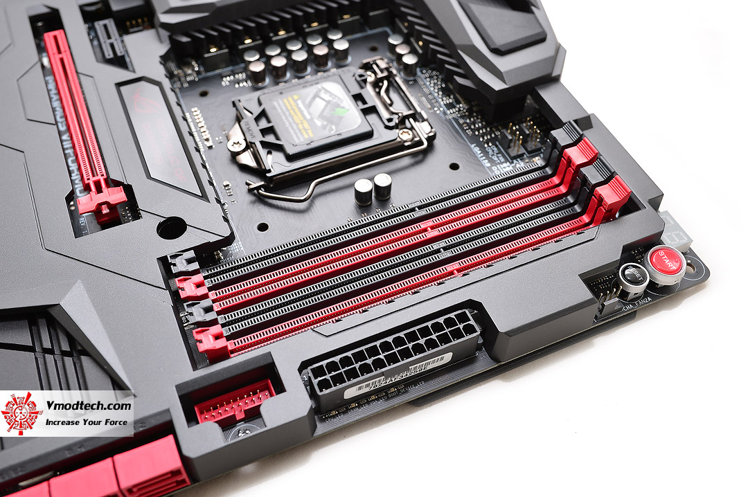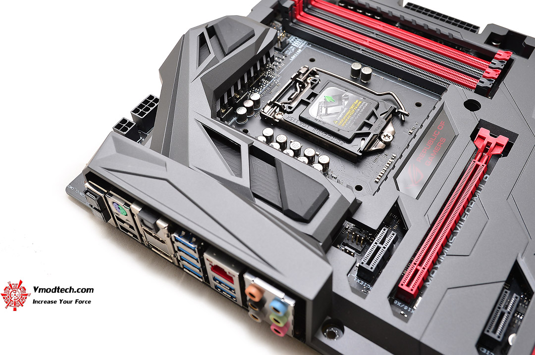 หน้าตาของมาเธอร์บอร์ดรุ่นนี้ จะออกแนวเข้มขรึมดำคาดแดงดุดัน ตามคอนเซปต์ของบอร์ดในตระกูล ROG ครับ
