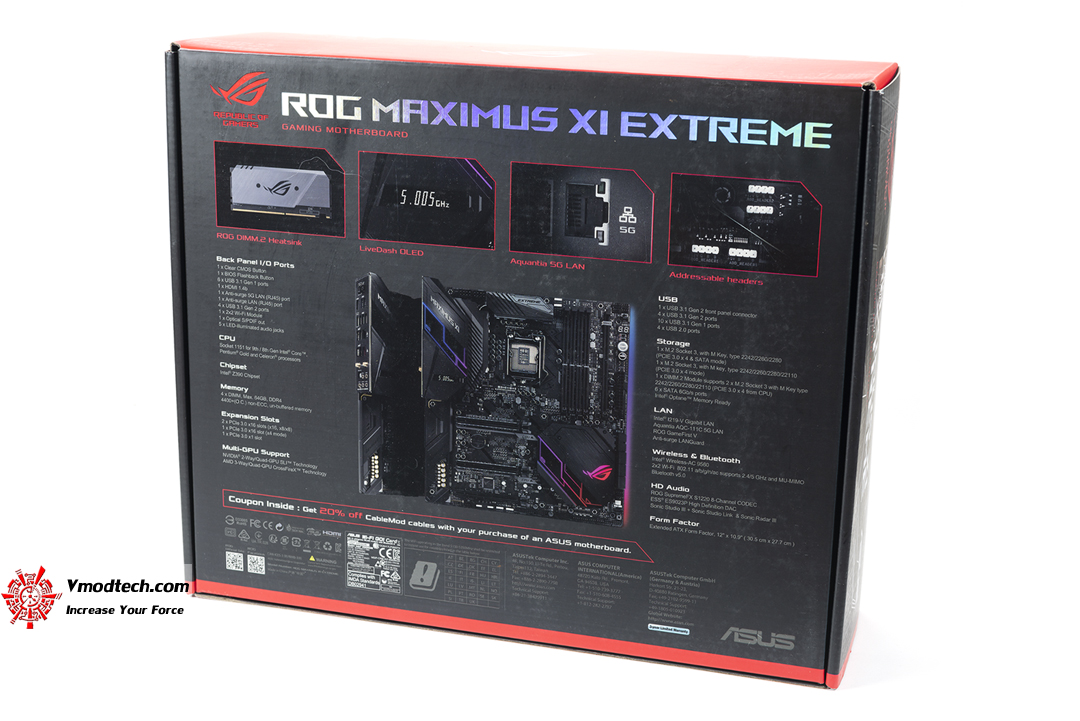 กล่องบรรจุ ASUS ROG MAXIMUS XI EXTREME นั้นจะมีขนาดค่อนไปทางใหญ่ตามขนาดมาเธอร์บอร์ด สีสรรออกแบบมาด้วยโทนสีเทาเข้มตัดกับสีดำ ด้านหลังก็จะมีรายละเอียดสำคัญๆของบอร์ดอธิบายมาให้เข้าใจกันครับ