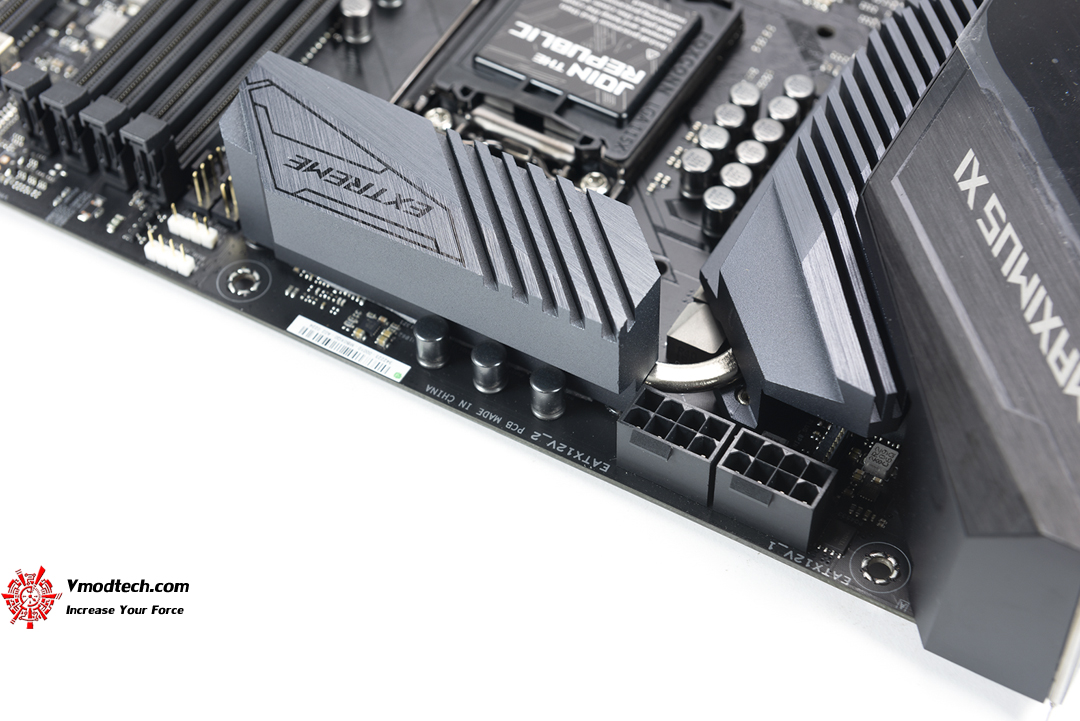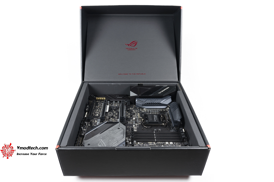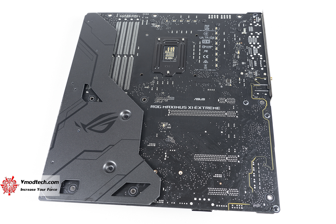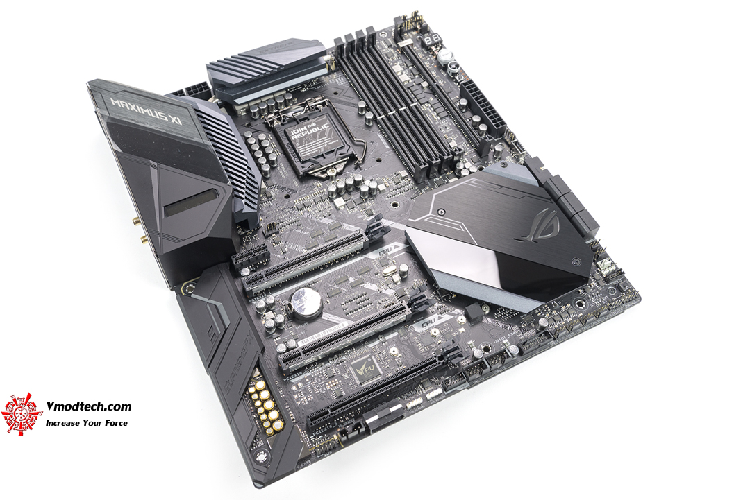 หน้าตาบอร์ด ROG MAXIMUS XI EXTREME แบบเต็มๆครับ เลย์เอาท์บนบอร์ดนั้นมาแบบเรียบหรูดูดี สีสรรที่เลือกใช้นั้นก็สวยงามด้วยพื้นดำตัดกับสีบนอุปกรณ์ต่างๆได้อย่างลงตัว