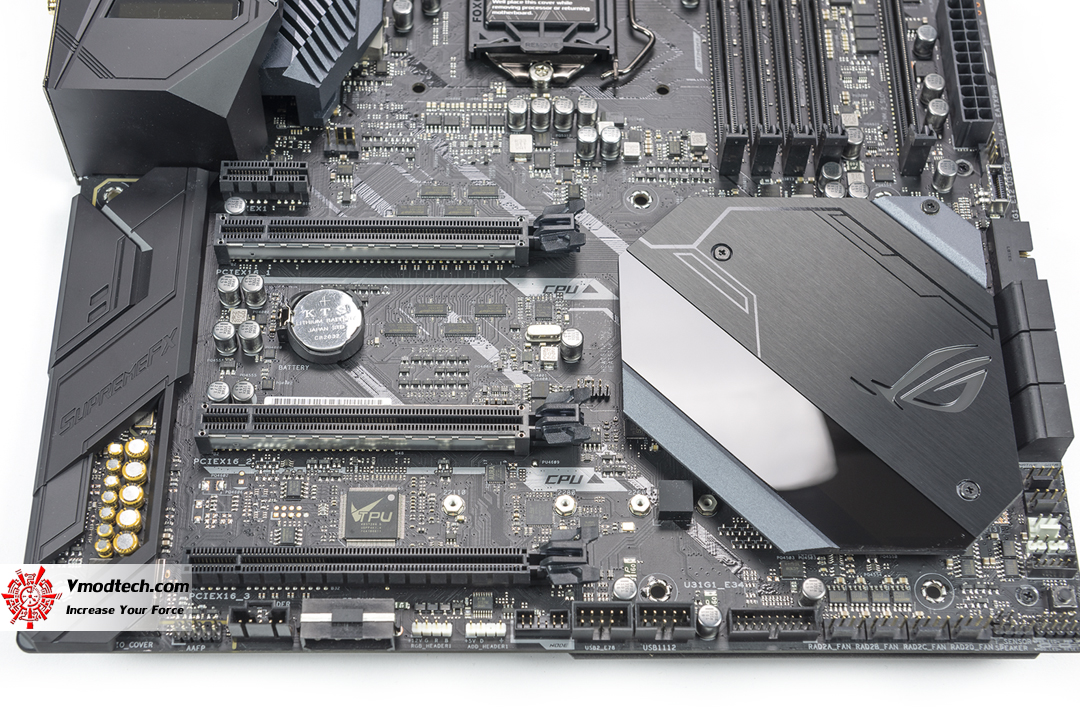 จุดเด่นที่เห็นบนบอร์ดนี้ก็คือพอร์ทเชื่อมต่อแบบ PCIe ที่มีมาให้ 3 ช่อง รองรับการทำงาน NVIDIA® 2-Way SLI™ Technology และ AMD 3-Way CrossFireX™ Technology และภายใต้ฮีทซิ้งค์ด้านขวามือนั้นจะเป็นช่องเสียบ M.2 จำนวนสองช่อง ซึ่งหนึ่งช่องในนั้นจะรองรับทั้ง M.2 SATA และ M.2 PCIe ส่วนอีกช่องจะรองรับ M.2 PCIe อย่างเดียว ตรงนี้สามารถตรวจสอบได้จากคู่มือนะครับ