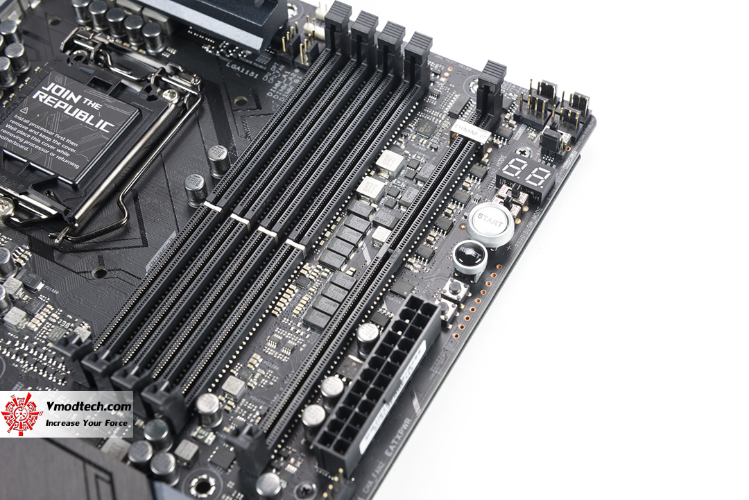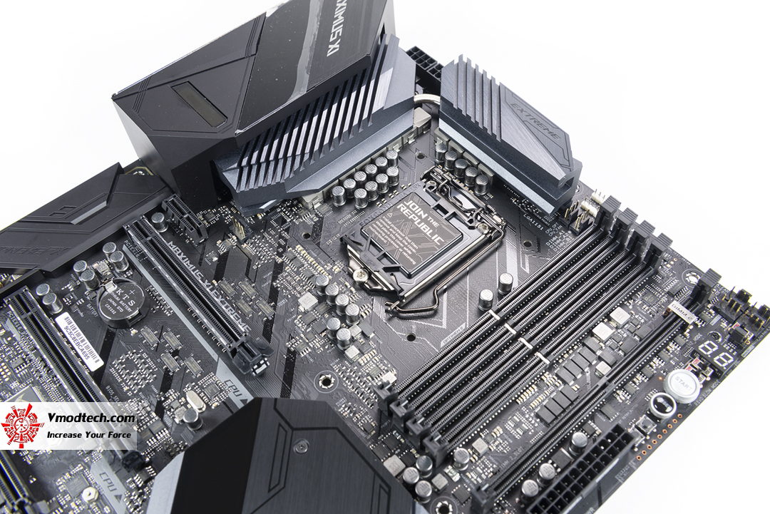 บริเวณโซนกลางซึ่งเป็นโซนของซ๊อกเกตซีพียูและช่องเสียบแรม และบรรดาปุ่มควบคุมต่างๆ แรมนั้นรองรับการทำงานได้ 4 x DIMM, Max. 64GB, DDR4 4400(O.C)/4266(O.C.)/4133(O.C.)/4000(O.C.)/3866(O.C.)/3733(O.C.)/3600(O.C.)/3466(O.C.)/3400(O.C.)/3333(O.C.)/3300(O.C.)/3200(O.C.)/3000(O.C.)/2800(O.C.)/2666/2400/2133 MHz Non-ECC, Un-buffered Memory ส่วนช่อง DIMM 2 นั้นมีเอาไว้เพื่อใส่ SSD แบบ M.2 PCIe 3.0 X4 แต่ต้องติดตั้งกับอุปกรณ์เสริมก่อนนะครับ