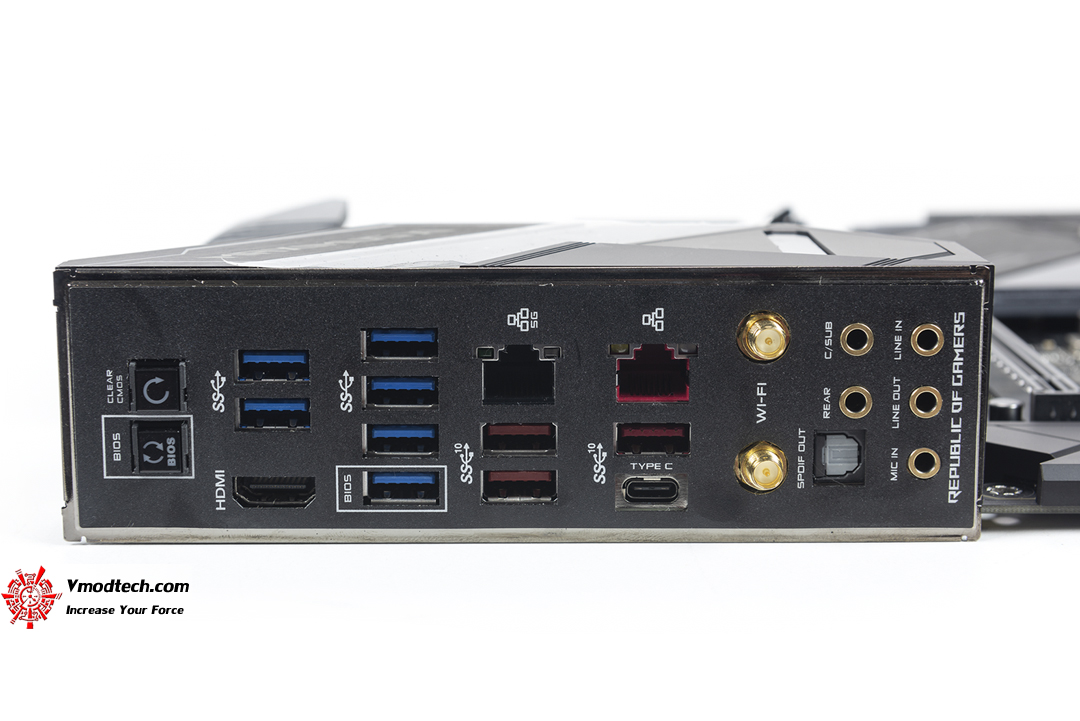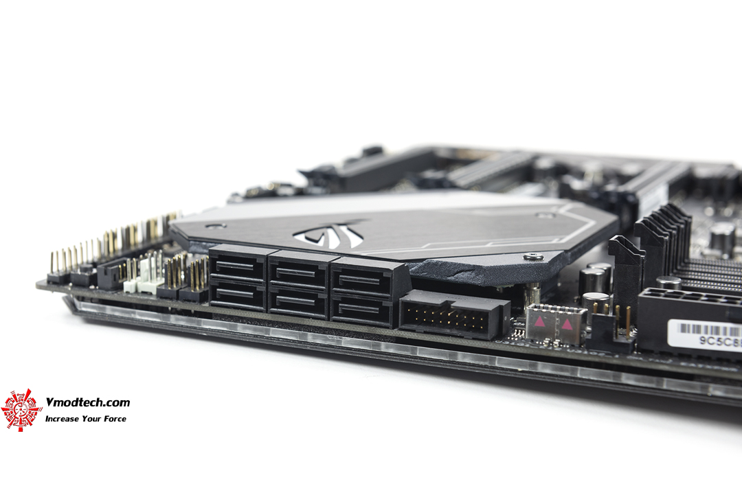 พอร์ทการเชื่อมต่อแบบ SATA III นั้นจะมีมาให้หกช่องครับ และที่ตรงระหว่างแผ่นรอง PCB ด้านล่างกับตัว PCB นั้นจะเห็นว่ามีพลาสติกใสๆ ซึ่งตรงนั้นจะเป็นจุดที่สามารถเปล่งแสงออกมาได้นะ