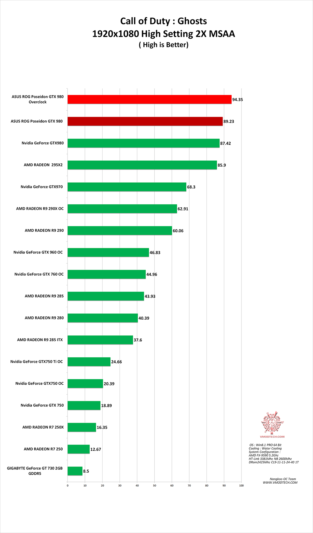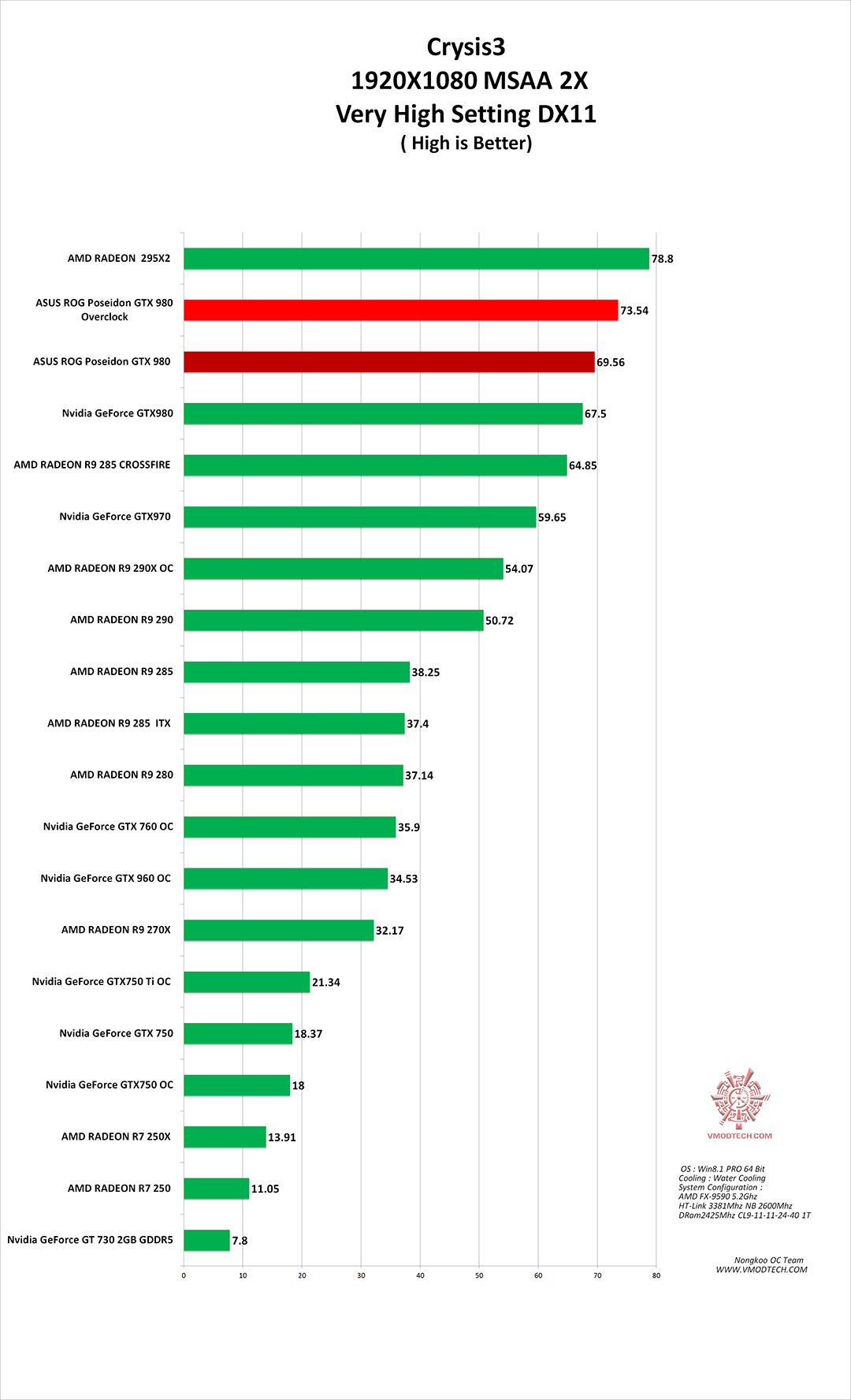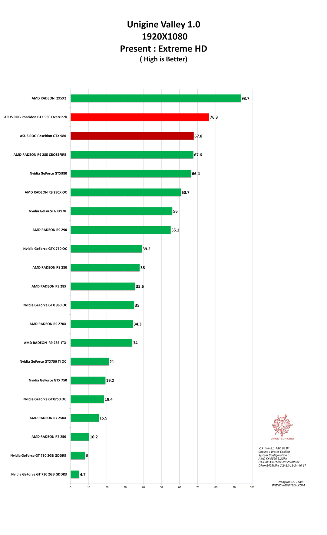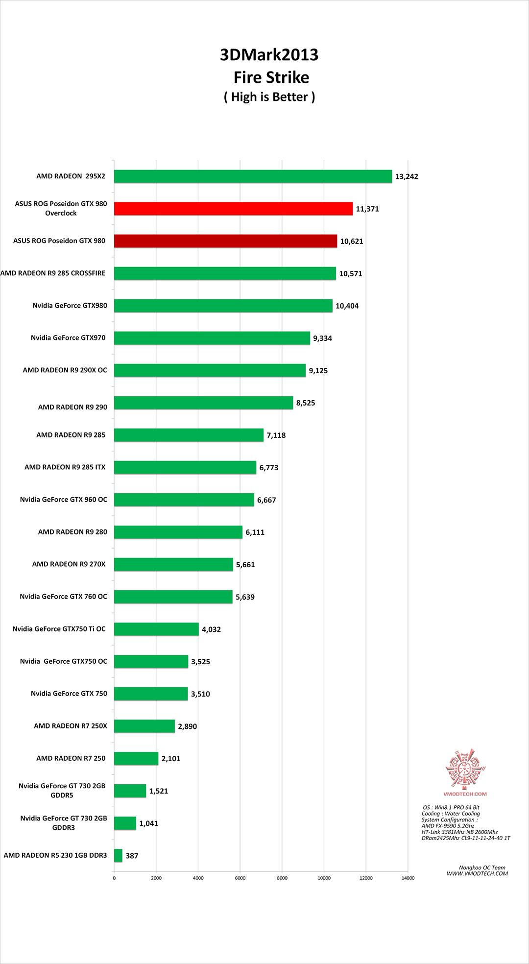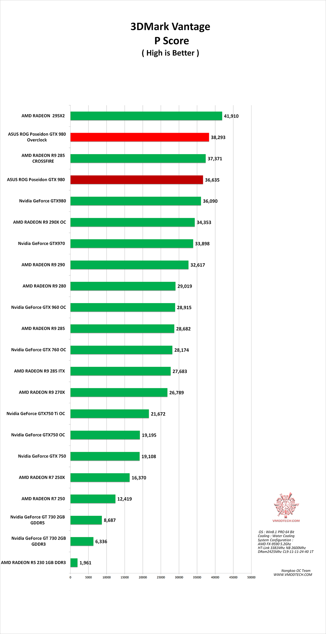 ก็มาถึงช่วงท้ายกันครับสำหรับการทดสอบ ASUS ROG Poseidon GTX 980 ที่วันนี้ทำประสิทธิภาพความแรงได้แบบเต็มประสิทธิภาพทั้งในสถานะเดิมๆและโอเวอร์คล๊อกโดยโอเวอร์คล๊อกใช้งานกันแบบเต็มๆที่ Core 1364Mhz Memory 2006Mhz Boost 1465Mhz ส่วน GPU Boost นั้นจะอยู่ที่ 1502Mhz ตลอดการทดสอบอีกทั้งยังกดกันแบบเต็มๆที่ความเร็ว Core 1403Mhz Memory 2006Mhz Boost 1504Mhz กันแบบเต็มๆ โดย GPU Boost อยู่ที่ 1540Mhz กันแบบเต็มๆ ถือได้ว่าแรงตามมาตรฐานของ ASUS ROG ที่พกพาทั้งความแรงรวมไปถึงประสิทธิภาพการโอเวอร์คล๊อกขั้นเทพฯ อีกทั้งบรรดาวัสดุอุปกรณ์ต่างๆที่เน้นมาตรฐานไม่ว่าจะเป็น DIGI+ VRM with 10-phase Super Alloy Powerคุณภาพสูงขึ้นอีก 30% และมีความคงทนเพิ่มขึ้นอีก 2.5 เท่า รวมทั้ง Japanese-made black metallic capacitors มีความคงทนต่อุณหภูมิสูงดีขึ้นอีก 20% และมีอายุการใช้งานที่ยาวนานขึ้นอีก 5 เท่า ให้มาแบบเต็มๆ โดยจุดเด่นสำหรับ ASUS ROG Poseidon GTX 980 ที่ขาดไม่ได้คือระบบระบายความร้อนที่วันนี้ผ่านการทดสอบทุกอย่างไม่ว่าจะเป็นการกดกันเต็มๆด้วยโปรแกรม Furmark ที่อุณหภูมิฟูลโหลดอยู่เพียงแค่ 48องศาฯเท่านั้นเองครับ ส่วนในการเทสใช้งานโปรแกรม 3D ต่างๆรวมไปถึงการทดสอบเล่นเกมส์ต่างๆแบบเปิดกันสุดๆความร้อนก้ไม่เกิน 50องศาฯครับถือว่าเย็นจัดมากๆกับการ์ดจอในรุ่นใหญ่สุดแบบนี้ เรียกได้ว่าทั้งแรงทั้งเย็นครบเครื่องบรรดาขาโอเวอร์คล๊อกและคอเกมส์เมอร์ตามแบบฉบับ ROG ซีรี่ย์กันเลยทีเดียว เหมาะสำหรับบรรดาเกมส์เมอร์ขาแรงที่ต้องการความแรงดุดันสวยงามรวมไปถึงระบบระบายความร้อนขั้นเทพฯจาก ASUS DirectCU H2O รับรองว่า ASUS ROG Poseidon GTX 980 ไม่ทำให้ท่านผิดหวังแน่นอน โดยราคาวางจำหน่ายในไทยก็ตกอยู่อยู่ราวๆ 2XXXXบาทครับ สำหรับในวันนี้กระผมก็ขอตัวลาไปก่อน พบกันใหม่เร็วๆนี้กับรีวิวอุปกรณ์ใหม่ๆจัดเต็มทุกการทดสอบที่ Vmodtech.com สวัสดีครับ