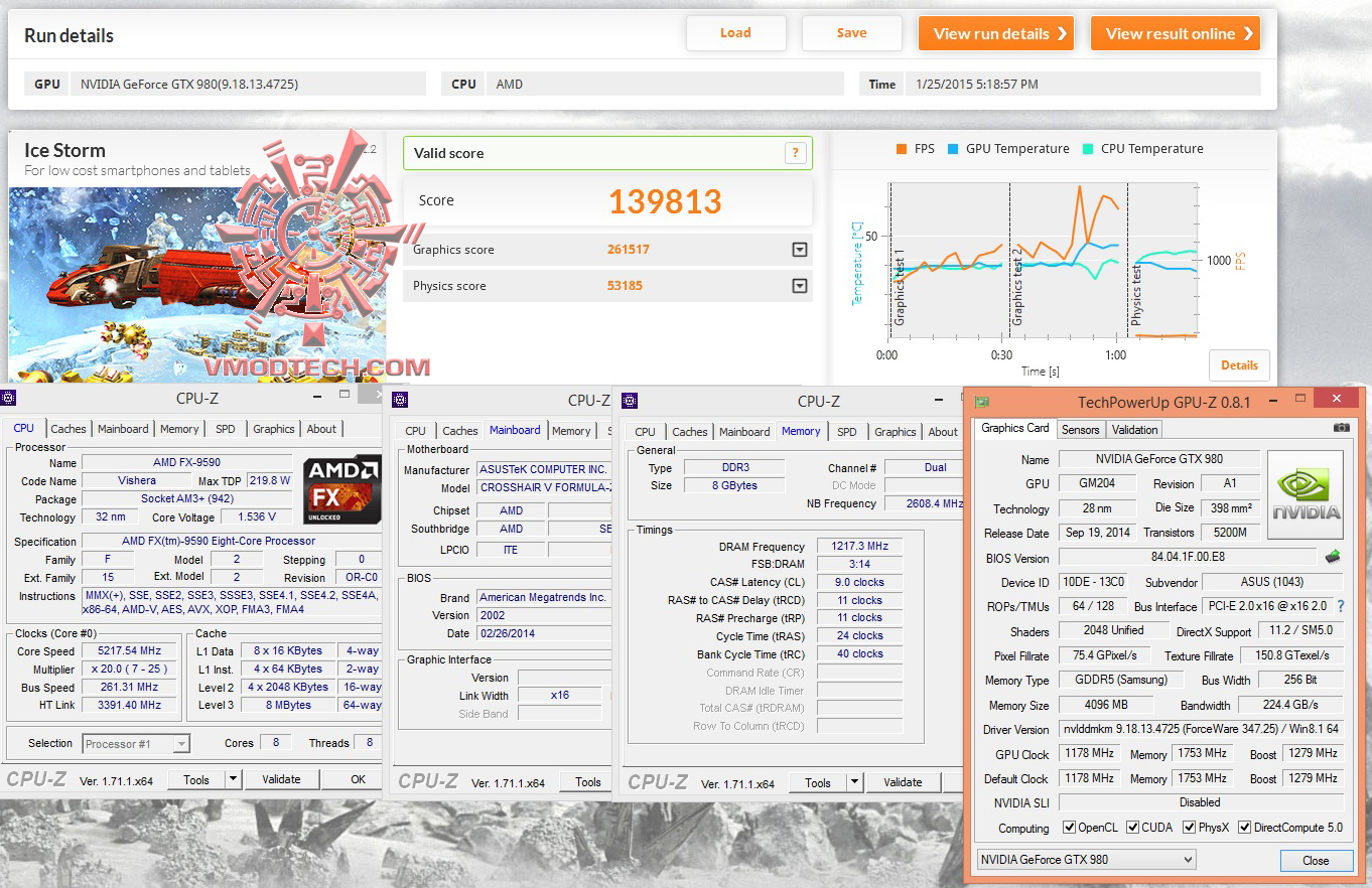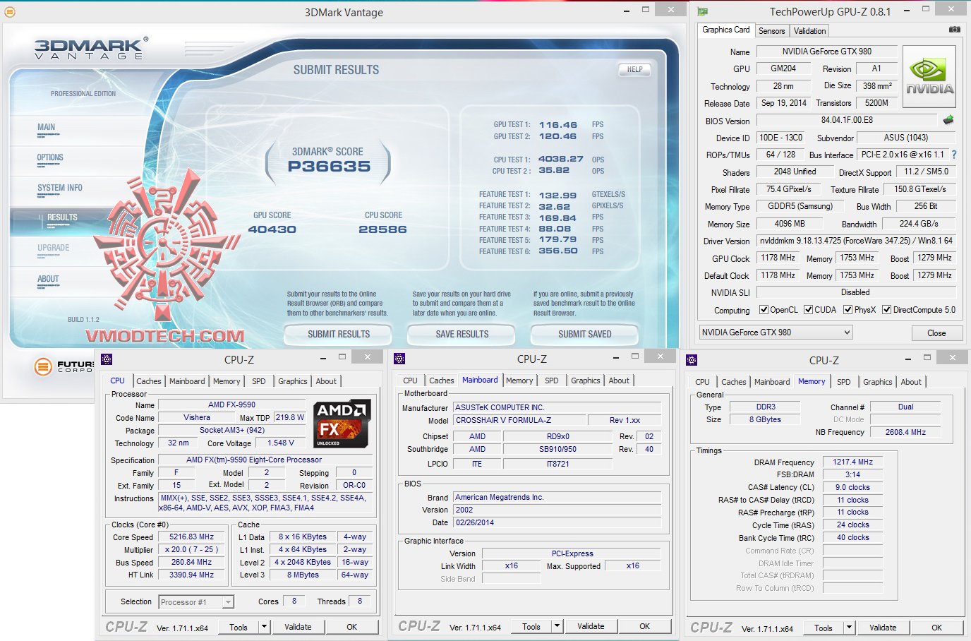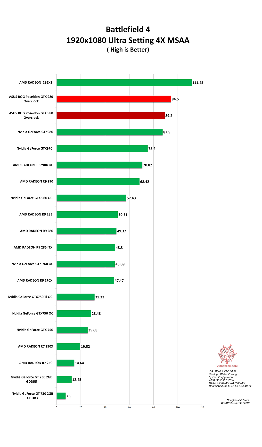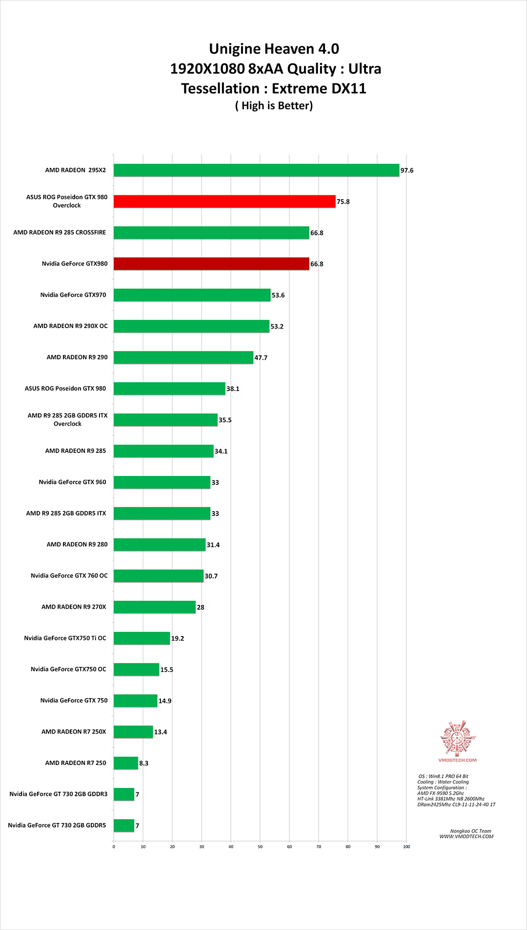 ก็มาถึงช่วงท้ายกันครับสำหรับการทดสอบ ASUS ROG Poseidon GTX 980 ที่วันนี้ทำประสิทธิภาพความแรงได้แบบเต็มประสิทธิภาพทั้งในสถานะเดิมๆและโอเวอร์คล๊อกโดยโอเวอร์คล๊อกใช้งานกันแบบเต็มๆที่ Core 1364Mhz Memory 2006Mhz Boost 1465Mhz ส่วน GPU Boost นั้นจะอยู่ที่ 1502Mhz ตลอดการทดสอบอีกทั้งยังกดกันแบบเต็มๆที่ความเร็ว Core 1403Mhz Memory 2006Mhz Boost 1504Mhz กันแบบเต็มๆ โดย GPU Boost อยู่ที่ 1540Mhz กันแบบเต็มๆ ถือได้ว่าแรงตามมาตรฐานของ ASUS ROG ที่พกพาทั้งความแรงรวมไปถึงประสิทธิภาพการโอเวอร์คล๊อกขั้นเทพฯ อีกทั้งบรรดาวัสดุอุปกรณ์ต่างๆที่เน้นมาตรฐานไม่ว่าจะเป็น DIGI+ VRM with 10-phase Super Alloy Powerคุณภาพสูงขึ้นอีก 30% และมีความคงทนเพิ่มขึ้นอีก 2.5 เท่า รวมทั้ง Japanese-made black metallic capacitors มีความคงทนต่อุณหภูมิสูงดีขึ้นอีก 20% และมีอายุการใช้งานที่ยาวนานขึ้นอีก 5 เท่า ให้มาแบบเต็มๆ โดยจุดเด่นสำหรับ ASUS ROG Poseidon GTX 980 ที่ขาดไม่ได้คือระบบระบายความร้อนที่วันนี้ผ่านการทดสอบทุกอย่างไม่ว่าจะเป็นการกดกันเต็มๆด้วยโปรแกรม Furmark ที่อุณหภูมิฟูลโหลดอยู่เพียงแค่ 48องศาฯเท่านั้นเองครับ ส่วนในการเทสใช้งานโปรแกรม 3D ต่างๆรวมไปถึงการทดสอบเล่นเกมส์ต่างๆแบบเปิดกันสุดๆความร้อนก้ไม่เกิน 50องศาฯครับถือว่าเย็นจัดมากๆกับการ์ดจอในรุ่นใหญ่สุดแบบนี้ เรียกได้ว่าทั้งแรงทั้งเย็นครบเครื่องบรรดาขาโอเวอร์คล๊อกและคอเกมส์เมอร์ตามแบบฉบับ ROG ซีรี่ย์กันเลยทีเดียว เหมาะสำหรับบรรดาเกมส์เมอร์ขาแรงที่ต้องการความแรงดุดันสวยงามรวมไปถึงระบบระบายความร้อนขั้นเทพฯจาก ASUS DirectCU H2O รับรองว่า ASUS ROG Poseidon GTX 980 ไม่ทำให้ท่านผิดหวังแน่นอน โดยราคาวางจำหน่ายในไทยก็ตกอยู่อยู่ราวๆ 2XXXXบาทครับ สำหรับในวันนี้กระผมก็ขอตัวลาไปก่อน พบกันใหม่เร็วๆนี้กับรีวิวอุปกรณ์ใหม่ๆจัดเต็มทุกการทดสอบที่ Vmodtech.com สวัสดีครับ