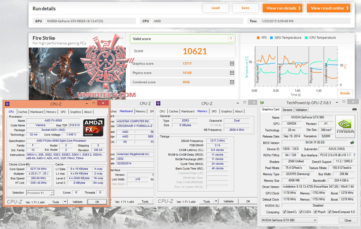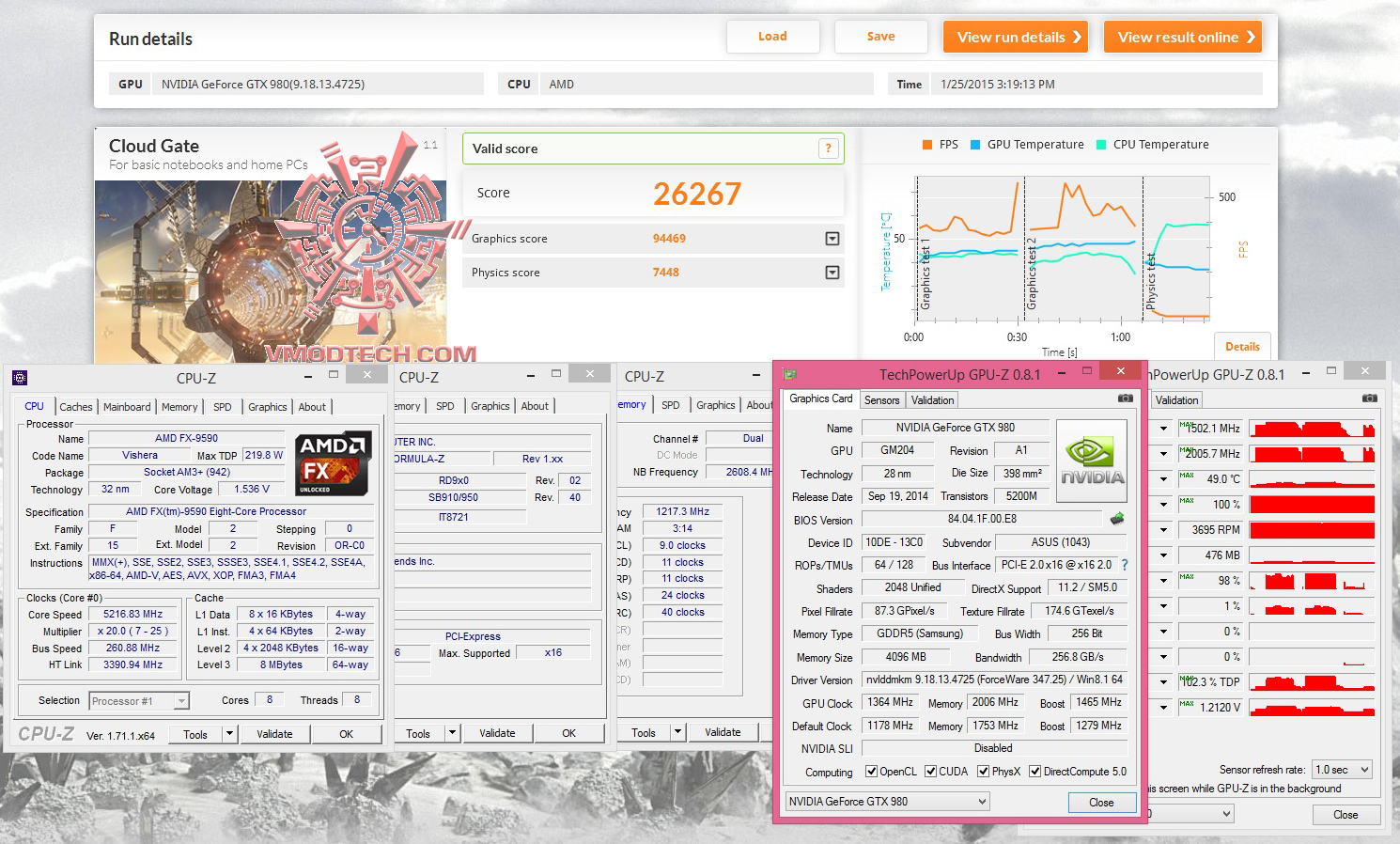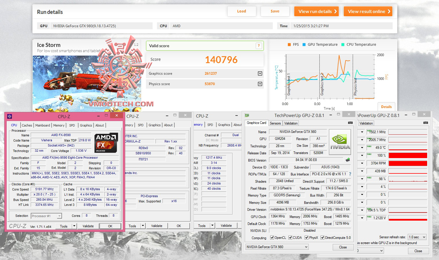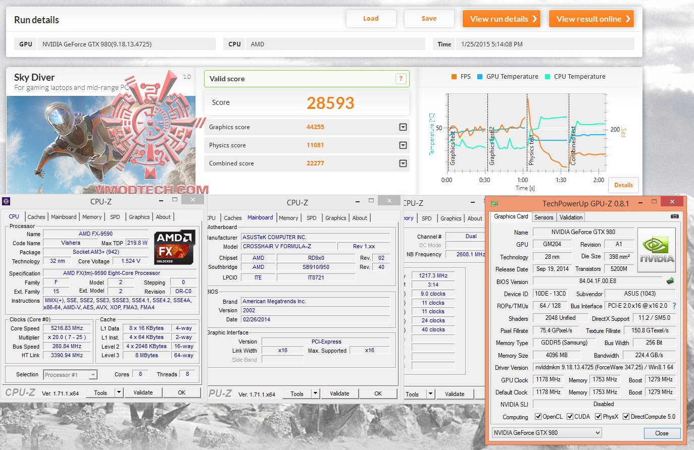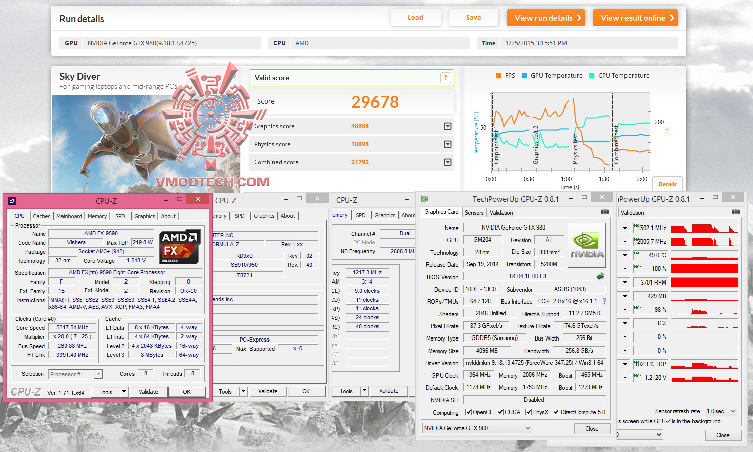 ก็มาถึงช่วงท้ายกันครับสำหรับการทดสอบ ASUS ROG Poseidon GTX 980 ที่วันนี้ทำประสิทธิภาพความแรงได้แบบเต็มประสิทธิภาพทั้งในสถานะเดิมๆและโอเวอร์คล๊อกโดยโอเวอร์คล๊อกใช้งานกันแบบเต็มๆที่ Core 1364Mhz Memory 2006Mhz Boost 1465Mhz ส่วน GPU Boost นั้นจะอยู่ที่ 1502Mhz ตลอดการทดสอบอีกทั้งยังกดกันแบบเต็มๆที่ความเร็ว Core 1403Mhz Memory 2006Mhz Boost 1504Mhz กันแบบเต็มๆ โดย GPU Boost อยู่ที่ 1540Mhz กันแบบเต็มๆ ถือได้ว่าแรงตามมาตรฐานของ ASUS ROG ที่พกพาทั้งความแรงรวมไปถึงประสิทธิภาพการโอเวอร์คล๊อกขั้นเทพฯ อีกทั้งบรรดาวัสดุอุปกรณ์ต่างๆที่เน้นมาตรฐานไม่ว่าจะเป็น DIGI+ VRM with 10-phase Super Alloy Powerคุณภาพสูงขึ้นอีก 30% และมีความคงทนเพิ่มขึ้นอีก 2.5 เท่า รวมทั้ง Japanese-made black metallic capacitors มีความคงทนต่อุณหภูมิสูงดีขึ้นอีก 20% และมีอายุการใช้งานที่ยาวนานขึ้นอีก 5 เท่า ให้มาแบบเต็มๆ โดยจุดเด่นสำหรับ ASUS ROG Poseidon GTX 980 ที่ขาดไม่ได้คือระบบระบายความร้อนที่วันนี้ผ่านการทดสอบทุกอย่างไม่ว่าจะเป็นการกดกันเต็มๆด้วยโปรแกรม Furmark ที่อุณหภูมิฟูลโหลดอยู่เพียงแค่ 48องศาฯเท่านั้นเองครับ ส่วนในการเทสใช้งานโปรแกรม 3D ต่างๆรวมไปถึงการทดสอบเล่นเกมส์ต่างๆแบบเปิดกันสุดๆความร้อนก้ไม่เกิน 50องศาฯครับถือว่าเย็นจัดมากๆกับการ์ดจอในรุ่นใหญ่สุดแบบนี้ เรียกได้ว่าทั้งแรงทั้งเย็นครบเครื่องบรรดาขาโอเวอร์คล๊อกและคอเกมส์เมอร์ตามแบบฉบับ ROG ซีรี่ย์กันเลยทีเดียว เหมาะสำหรับบรรดาเกมส์เมอร์ขาแรงที่ต้องการความแรงดุดันสวยงามรวมไปถึงระบบระบายความร้อนขั้นเทพฯจาก ASUS DirectCU H2O รับรองว่า ASUS ROG Poseidon GTX 980 ไม่ทำให้ท่านผิดหวังแน่นอน โดยราคาวางจำหน่ายในไทยก็ตกอยู่อยู่ราวๆ 2XXXXบาทครับ สำหรับในวันนี้กระผมก็ขอตัวลาไปก่อน พบกันใหม่เร็วๆนี้กับรีวิวอุปกรณ์ใหม่ๆจัดเต็มทุกการทดสอบที่ Vmodtech.com สวัสดีครับ