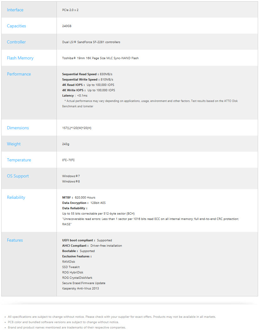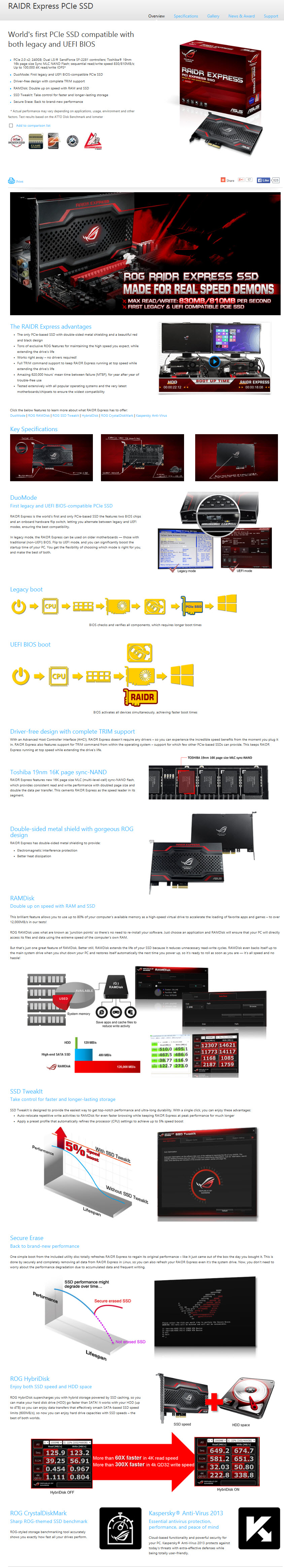 ตามสเป็กของ ASUS ROG RAIDR Express PCIe SSD 240GB นั้น การเชื่อมต่อนั้นผ่านทาง Interface PCI Express ใช้ NAND MLC Flash ขนาด 19nm จาก Toshiba และใช้คอนโทรลเลอร์ SandForce SF-2281 ในการควบคุม SSD ครับ และมี Raid Controller Mavell 9200 Series