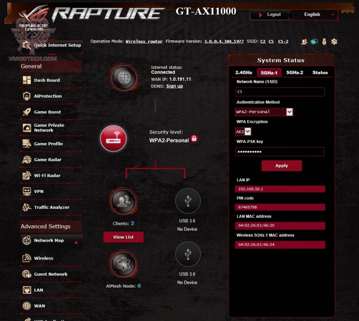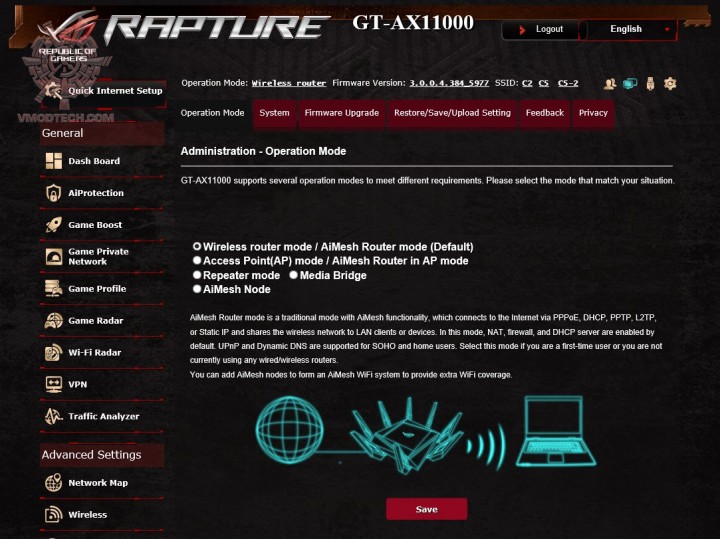 โหมดการทำงานของเจ้า RT-AC67U นั้นจะมีอยู่ 5 โหมดนะครับ คือ Wireless router mode/Ai Mesh Router mode, Repeater mode, Access point mode, Media bridge mode หรือจะปรับเป็น AiMesh Node ก็ได้ด้วย