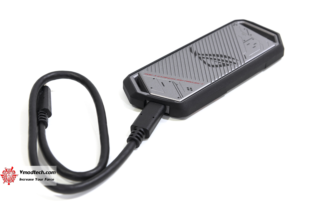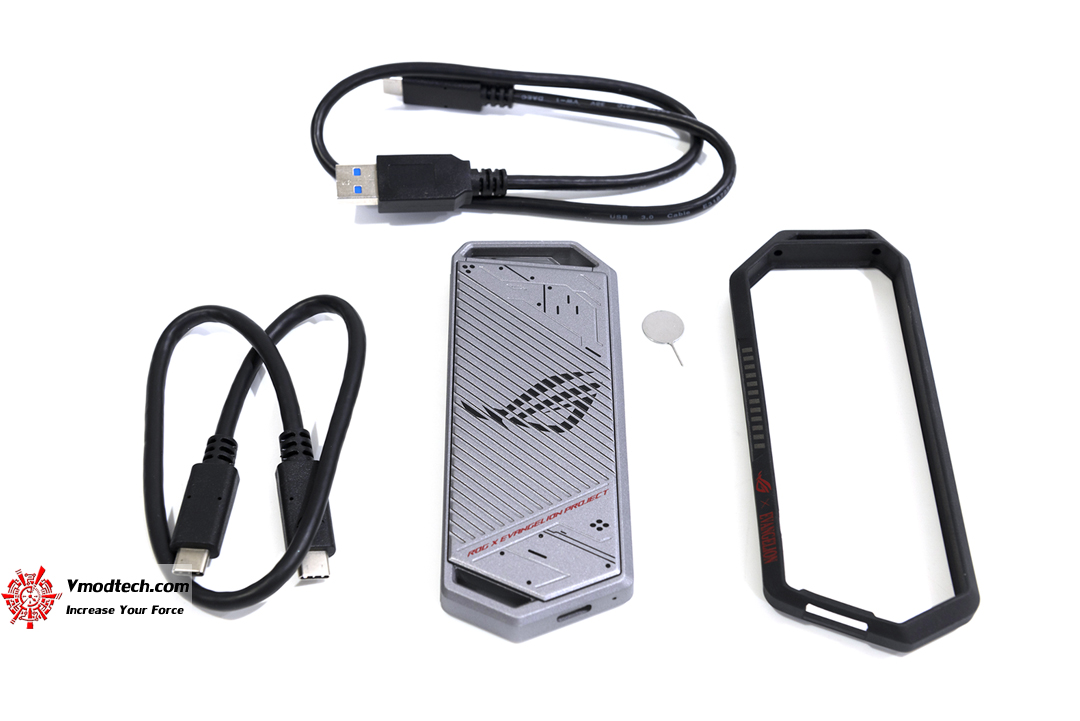 ภายในกล่อง ROG Strix Arion EVA Edition นั้นก็จะมีอุปกรณ์มาให้ตามรูปครับคือสายเชื่อมต่อแบบ USB Type-C to Type-C หนึ่งเส้น สายแบบ Type-A to Type-C อีกหนึ่งเส้น เคสกันลื่น พินสำหรับเปิดฝา และตัวกล่องใส่ SSD