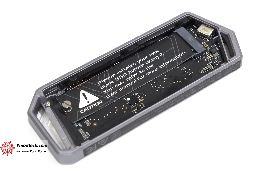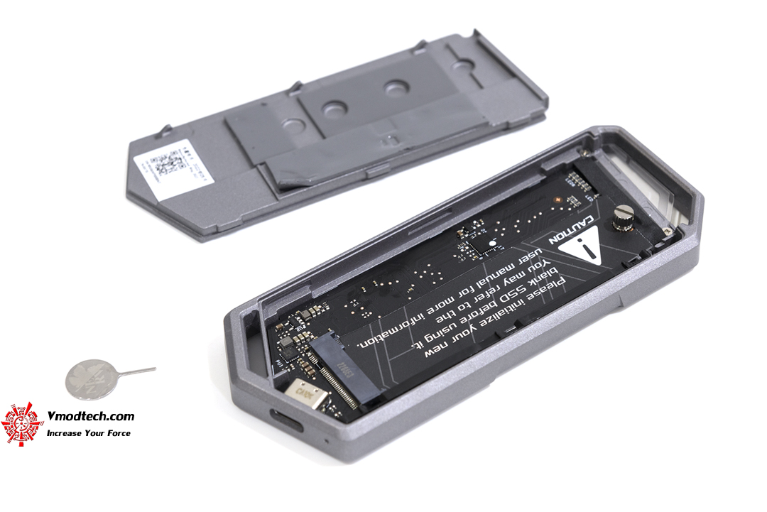 การใส่ SSD นั้นก็สามารถทำได้อย่างง่ายดายเลยครับ คือเราใช้พินที่ได้ถูกเตรียมมาในกล่อง เสียบเข้าไปตรงรูบริเวณพอร์ท USB Type-C ตามรูป ฝาด้านบนก็จะเด้งออกมาครับ เราสามารถยกออกได้เลย ที่ฝาจะเห็น Thermal pad เตรียมมาไว้ให้ด้วยครับ