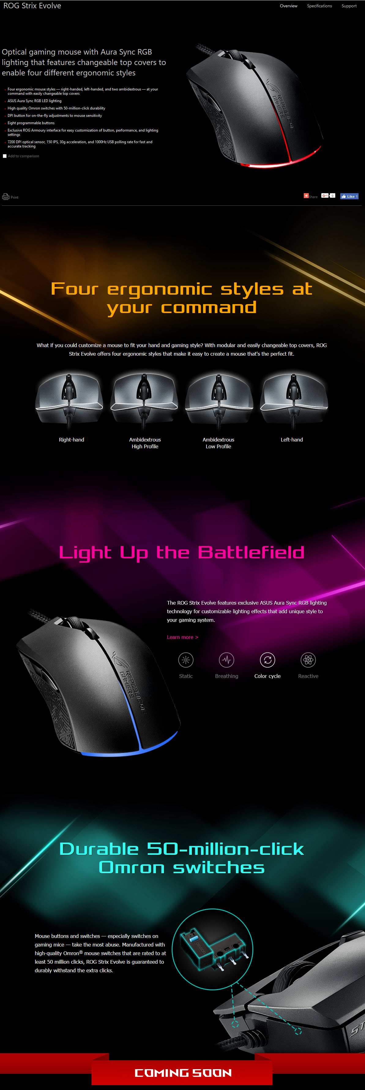 ในบรรดาผู้ผลิตเกมส์มิ่งเกียร์ในปัจจุบันนี้ ปฏิเสธไม่ได้เลยนะครับว่า ASUS นั้นถือเป็นผู้ผลิตที่พัฒนาผลิตภัณฑ์ของตัวเองอย่างต่อเนื่อง เกมส์มิ่งเกียร์ซีรีย์ Strix นั้นก็เป็นอีกรุ่นนึงที่ออกแบบมาให้สอดคล้องกับคอมโพเน้นท์อื่นๆที่อยู่ในซีรีย์ Strix ด้วยครับ วันนี้เรามีเมาส์รุ่นใหม่ล่าสุดที่ชื่อ ASUS ROG Strix Evolve มารีวิวให้ได้ชมกัน Strix Evolve นั้นเป็นเมาส์แบบ Optical มีความละเอียดสูงสุดที่ 7200 DPI มีการออกแบบมาแบบมิลเลอร์คือสองข้างสมมาตรกันแต่จะมีจุดเด่นที่มีฝาครอบด้านบนบริเวณใต้อุ้งมือมาให้สองชุดซึ่งแต่ละชุดนั้นจะมีส่วนโค้งนูนต่างกันเพื่อให้เหมาะกับการใช้งานมือซ้ายหรือมือขวา ก็สามารถเลือกปรับเอาได้เลย รวมถึงมันสามารถปรับแต่งแสงสีบนตัวเมาส์ผ่านทาง ASUS Aura Sync RGB ด้วย เรามาชมรายละเอียดกันเลยครับ