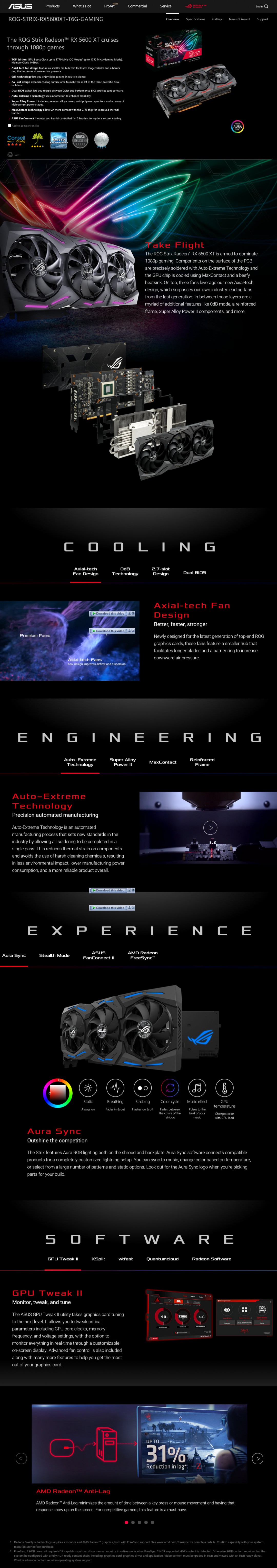 สวัสดีครับ พบกับบทความรีวิวกราฟฟิกการ์ดกันต่อเนื่องอีกรุ่นครับโดยวันนี้จะเป็นการ์ดระดับกลางสูงเน้นความคุ้มค่าหน้าตาดีในซีรีย์ ROG Strix คือ ASUS ROG Strix Gaming Radeon RX 5600 XT TOP Overclock ซึ่งการ์ดรุ่นนี้นั้นใช้ GPU AMD Radeon RX 5600 XT ซึ่งได้รับการปรับแต่งชุดระบายความร้อนที่เลือกใช้ชุดระบายความร้อนของ ASUS เอง ตัวการ์ดนั้นได้ถูกปรับแต่งชุดระบายความร้อนมาให้มีสมรรถนะที่ดีกว่าการ์ดมาตรฐานด้วยพัดลมคู่ที่เรียกว่า Axial-tech ซึ่งสามารถสร้างแรงลมในแนวแกนได้ดีกว่าพัดลมแบบปกติ การที่สามารถสร้างแรงลมอัดเข้าไปได้ในแนวแกนนี้จะสามารถกระจายความร้อนออกจากฮีทซิ้งค์ที่ได้ถูกออกแบบมาให้ใหญ่กว่าและเย็นกว่าจำนวนสามตัว รวมถึงแสงสีที่สามารถควบคุมผ่านทาง Aura Sync ที่สามารถปรับแต่งสีสรรได้ครอบคลุม RGB และยังปรับแต่งเอฟเฟกได้ 6 รูปแบบครับ และยังสามารถปิดแสงสีได้ด้วยปุ่มกดพิเศษครับ