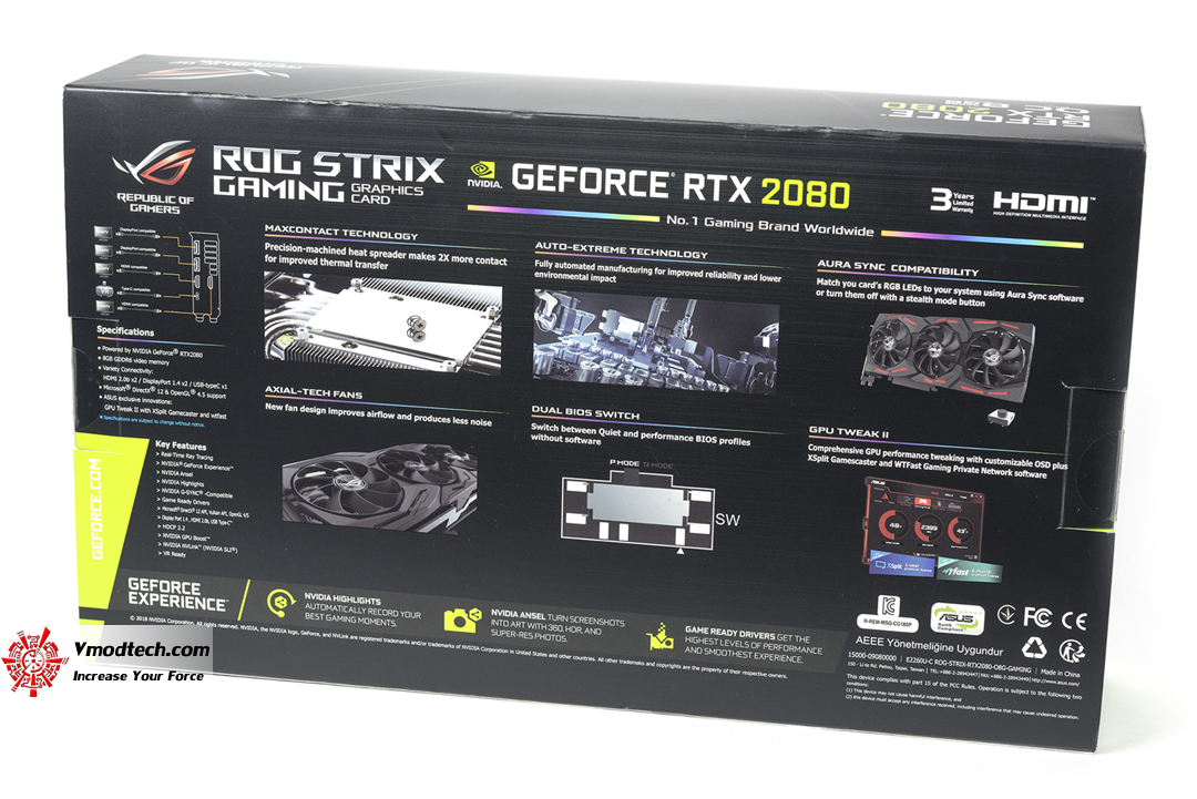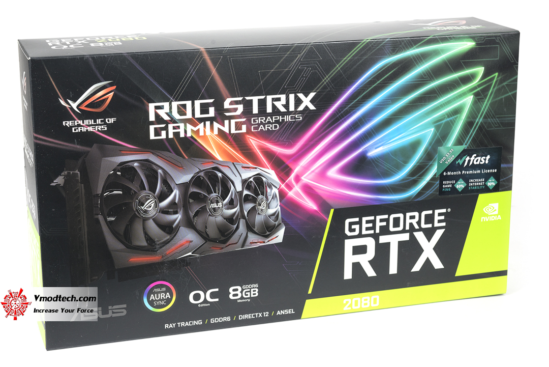 กล่องบรรจุของ ASUS ROG STRIX RTX 2080 Gaming นั้นมาพร้อมกับแพกเกจที่ถูกออกแบบภาพด้านหน้ากล่องสวยงามแบบคัลเลอร์ฟูล รายละเอียดและเทคโนโลยีต่างๆของการ์ดถูกอัดแน่นไว้ด้านหลัง